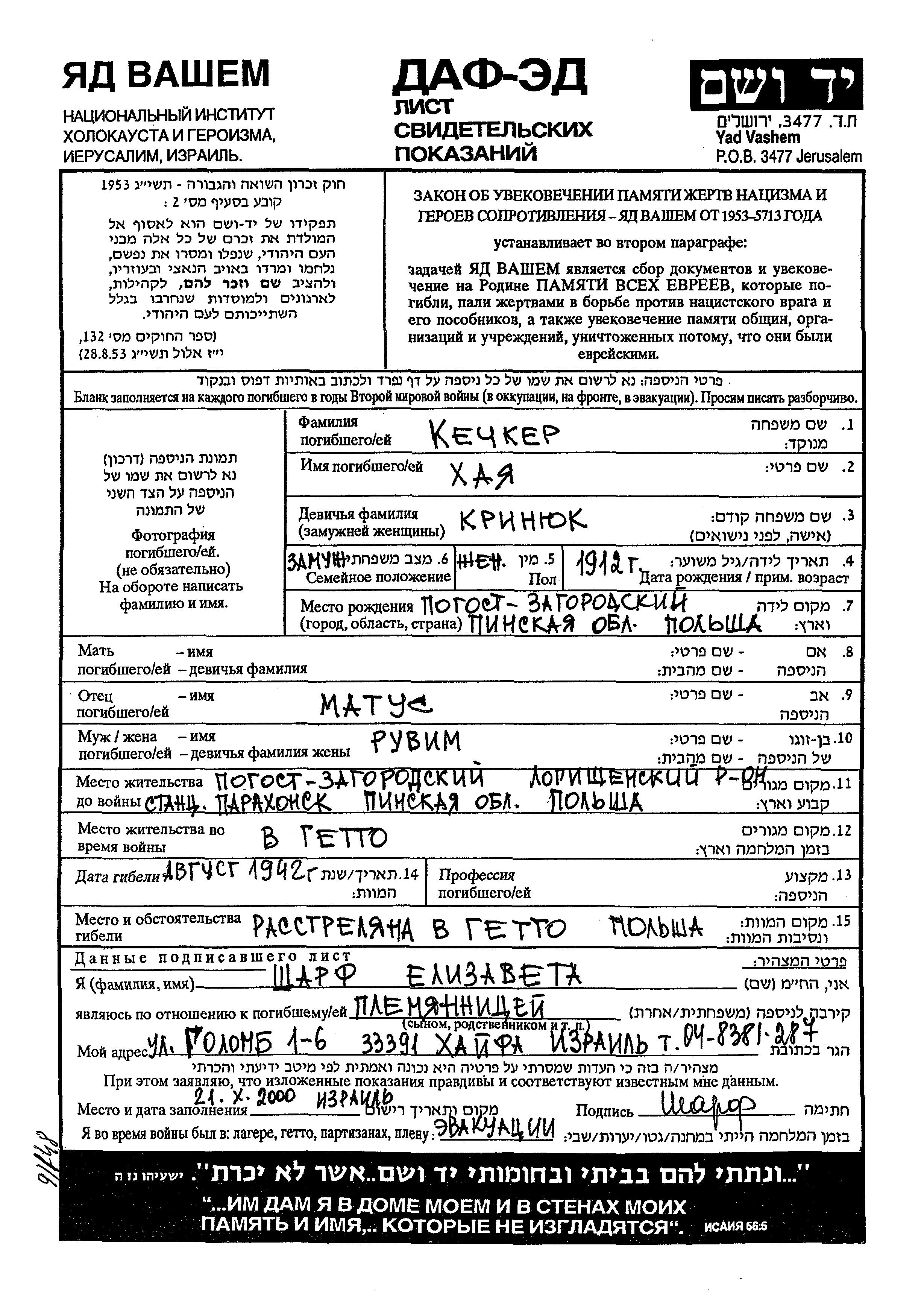 Khaia Kechker, geb. Krinyuk wurde im Jahr 1912 in Pogost Zagorodskiy, Polen geboren. Sie war die Tochter von Matus. Sie war Verheiratet. Vor dem Zweiten Weltkrieg lebte sie in Parochońsk, Polen. Während des Krieges war sie in Parochońsk, Polen.
