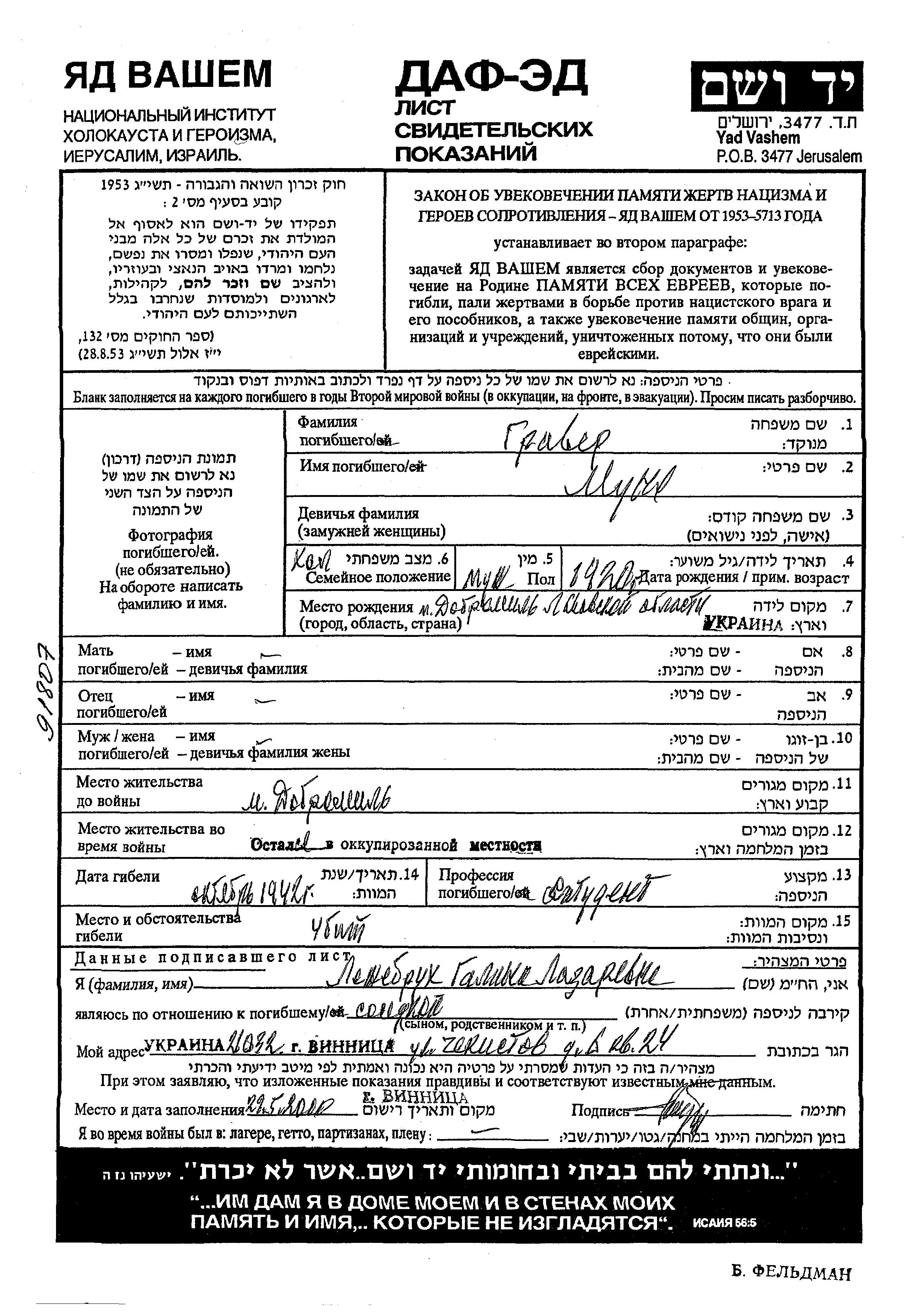 Munya Graver wurde im Jahr 1920 in Dobromil, Polen geboren. Er war Student und Ledig. Vor dem Zweiten Weltkrieg lebte er in Dobromil, Polen. Während des Krieges war er in Dobromil, Polen.
