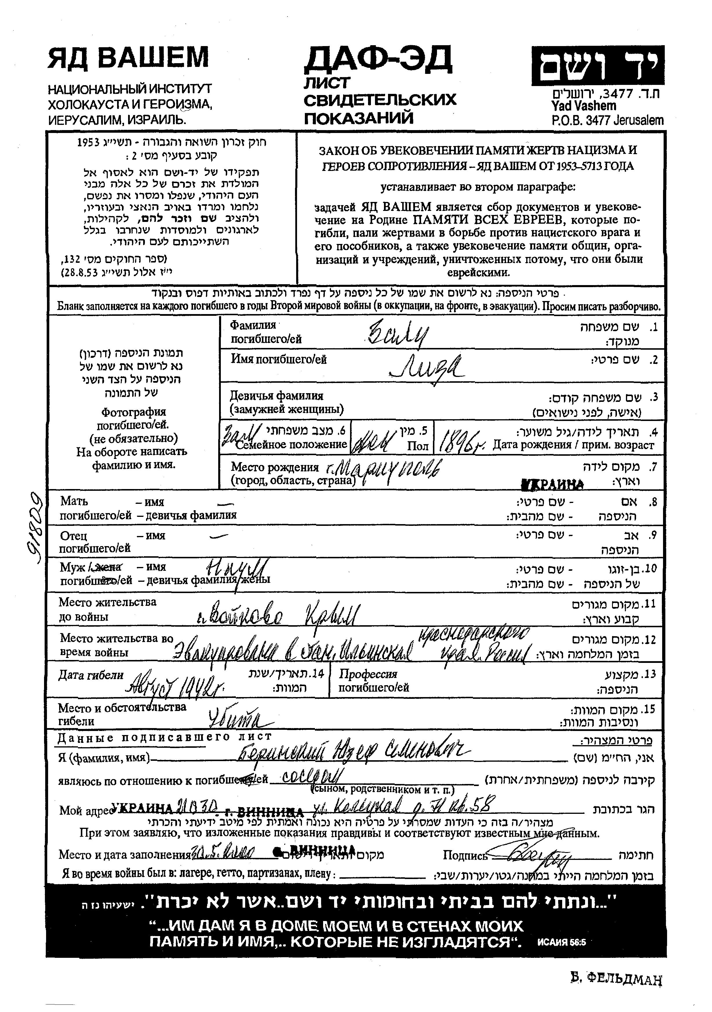 Juden wurden in der Schoah auf verschiedenste Weisen ermordet, unter anderem: Vergasen, Erschiessen, lebendig verbrannt werden, lebendig begraben werden, Tod durch Erschöpfung durch Zwangsarbeit, Epidemien, mangels jeder hygienischer Bedingung oder dem Fehlen medizinischer Versorgung. Manche Juden nahmen sich das Leben, um der Festnahme und weiterer Verfolgung zu entgehen oder ihr hoffnungsloses, nicht nachlassendes Leiden zu beenden. Zehntausende jüdische Soldaten der sowjetischen Armee, die als Kriegsgefangene gefangen genommen wurden, wurden als Juden selektiert und ermordet. Viele wurden als „vermisst“ registriert.