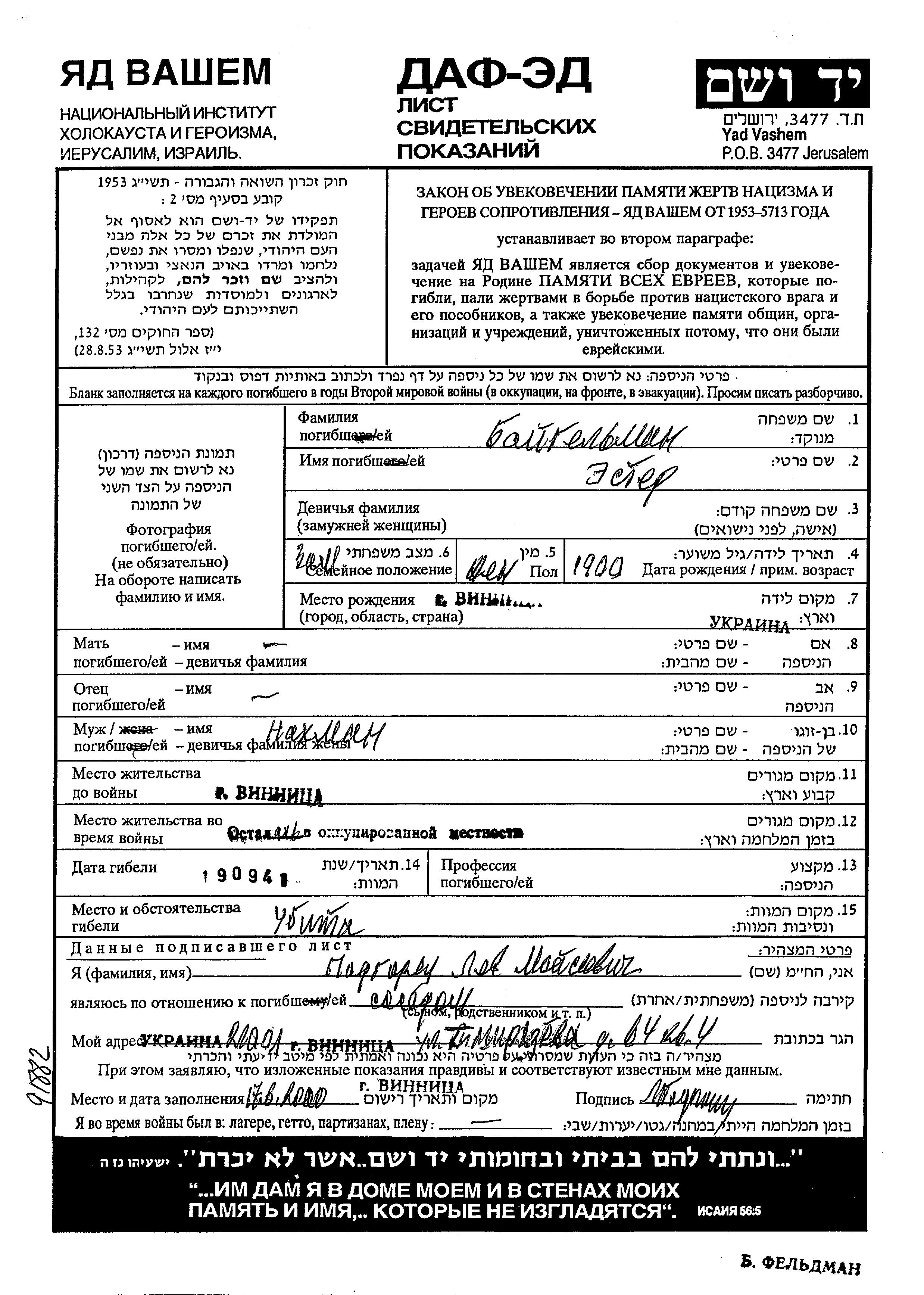 Baigelman Ester 1900 Vinnitsa, Ukraine (UdSSR) Gedenkblatt