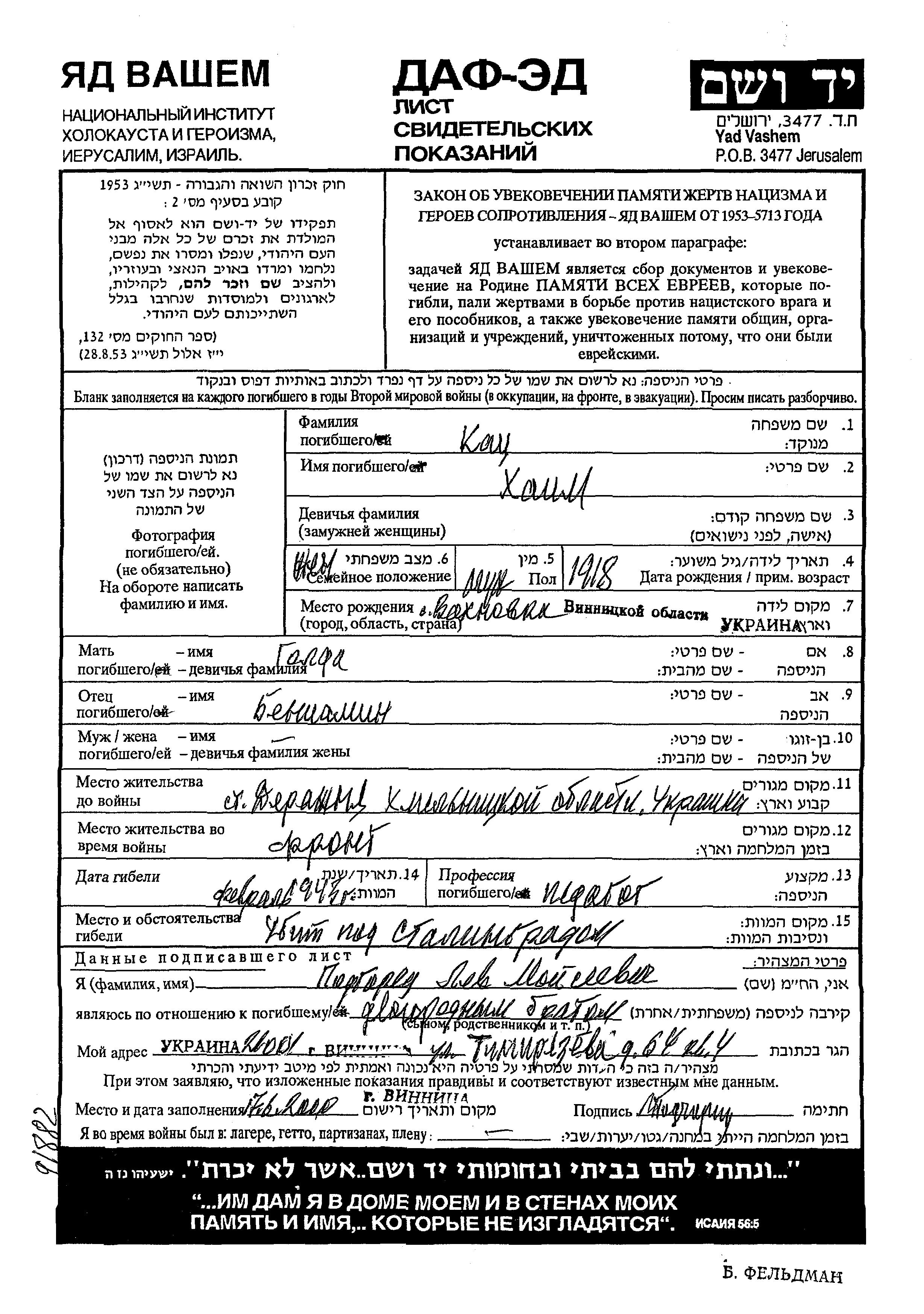 Khaim Katz wurde im Jahr 1918 in Vakhnovka, Ukraine (UdSSR) geboren. Er war der Sohn von Beniamin und Golda. Er war Lehrer/in und Verheiratet. Vor dem Zweiten Weltkrieg lebte er in Derazhnya, Ukraine (UdSSR). Khaim im Militärdienst umgekommen. Todesort: Stalingrad, Russland (UdSSR) im Jahr 1943.