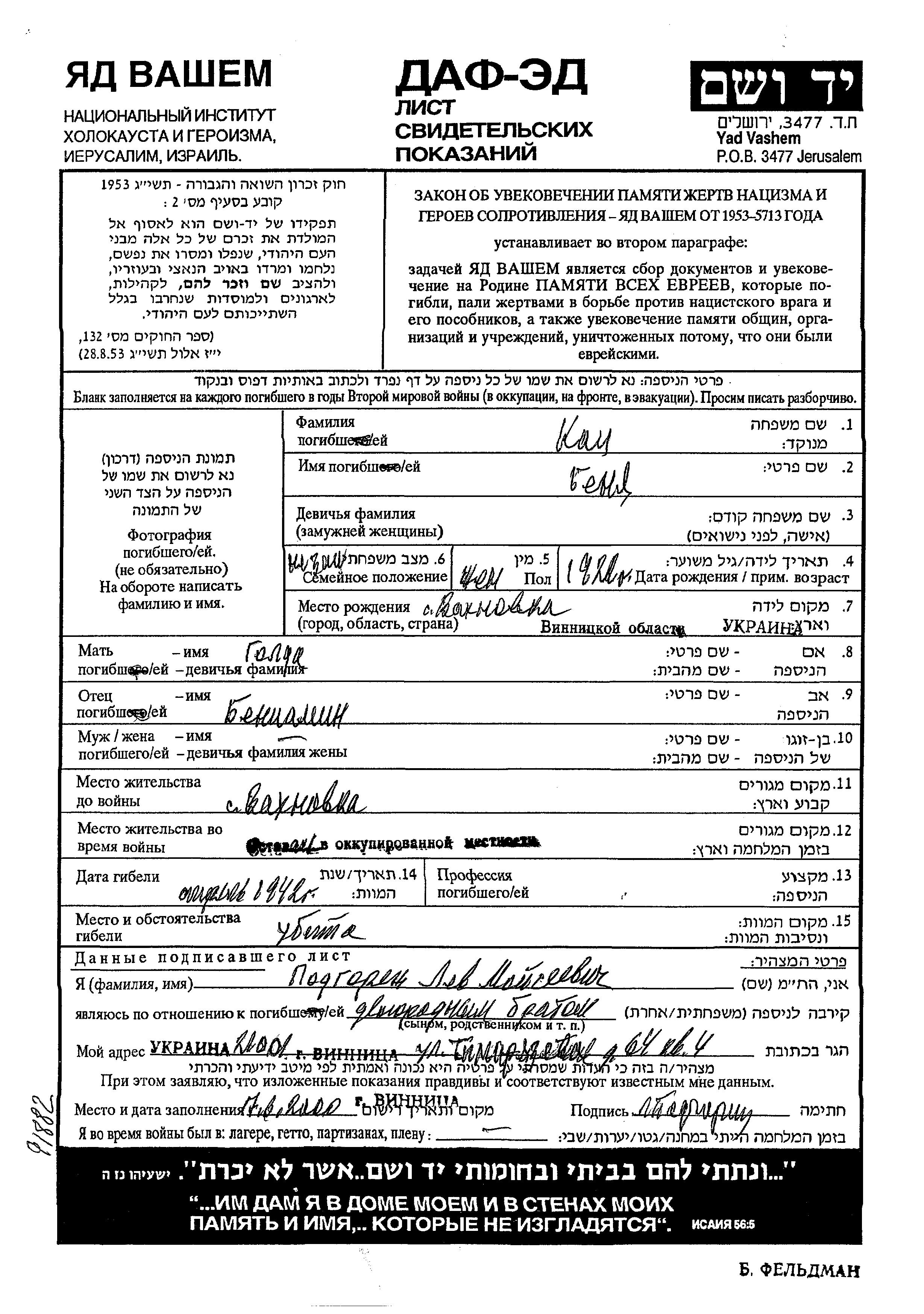 Katz Benya 1922 Vakhnovka, Ukraine (UdSSR) Gedenkblatt