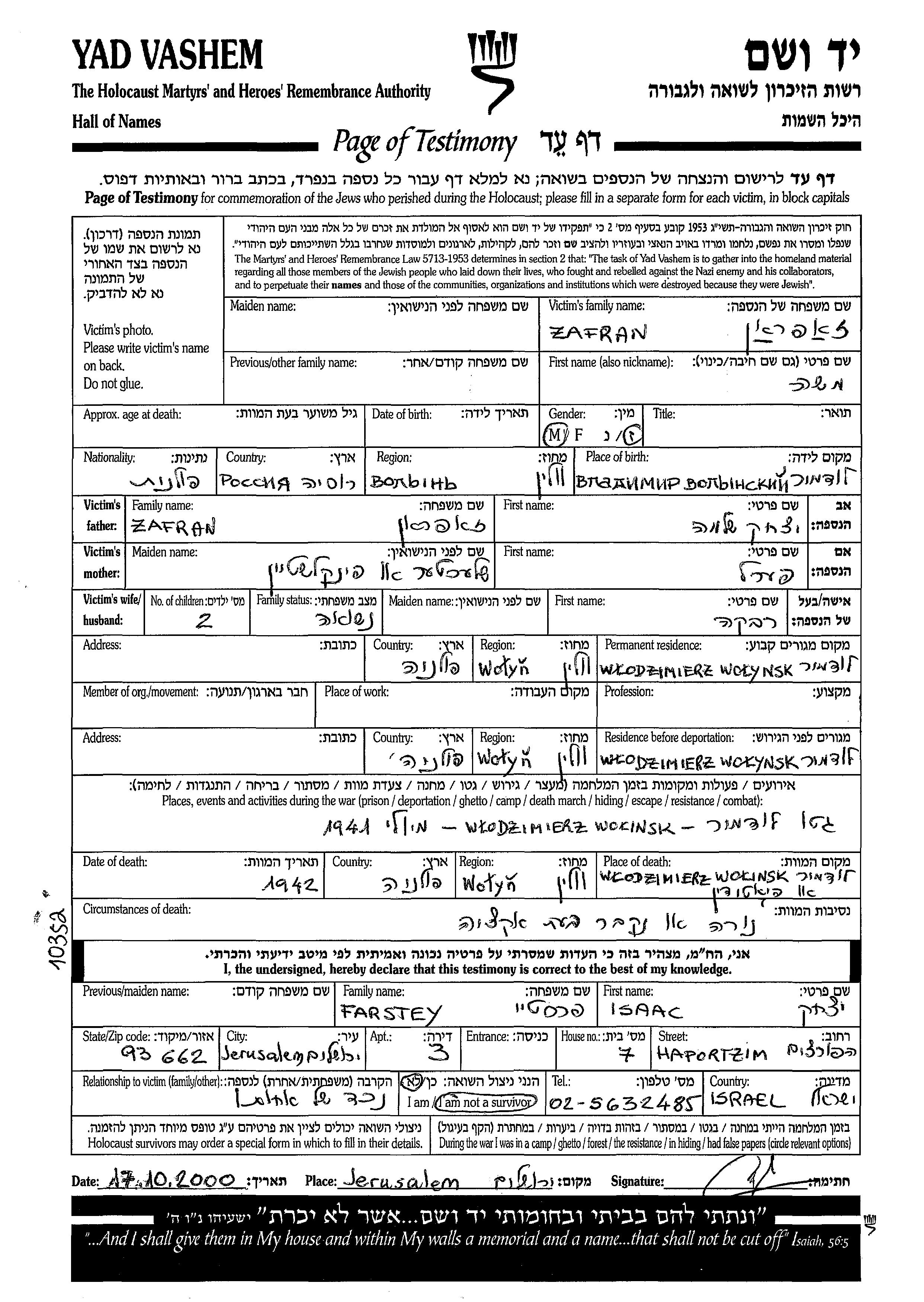 Moshe Zafran wurde in Vladimir Volinski, Polen geboren. Er war der Sohn von Yitzkhak Shlomo und Perl. Er war mit Rivka Verheiratet. Vor dem Zweiten Weltkrieg lebte er in Vladimir Volinski, Polen. Während des Krieges war er in Vladimir Volinski, Polen.