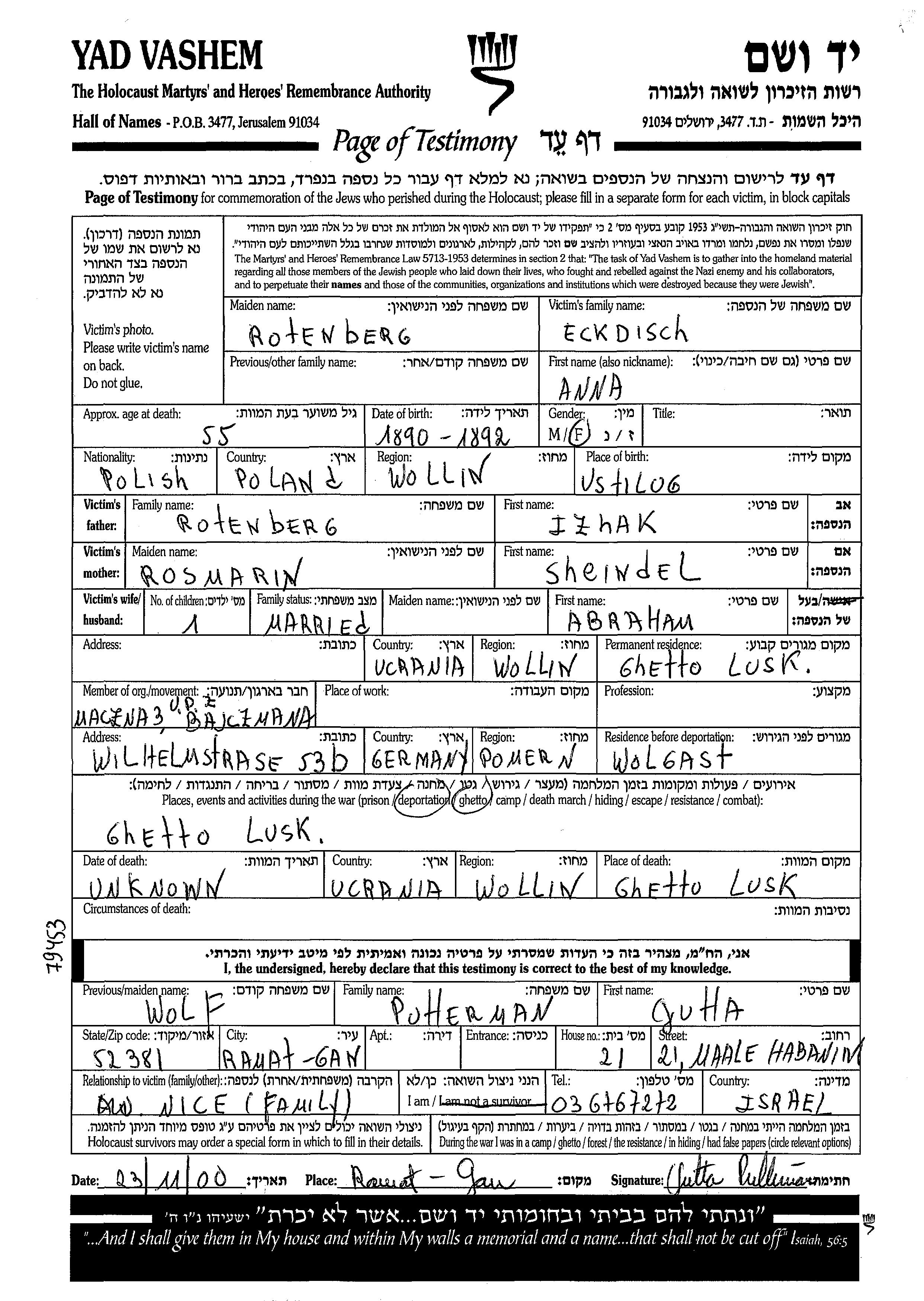 Anna Eckdisch, geb. Rotenberg wurde im Jahr 1892 in Ustilug, Polen geboren. Sie war die Tochter von Izhak und Sheindl. Sie war mit Abraham Verheiratet. Während des Krieges war sie in Wolgast, Deutsches Reich.