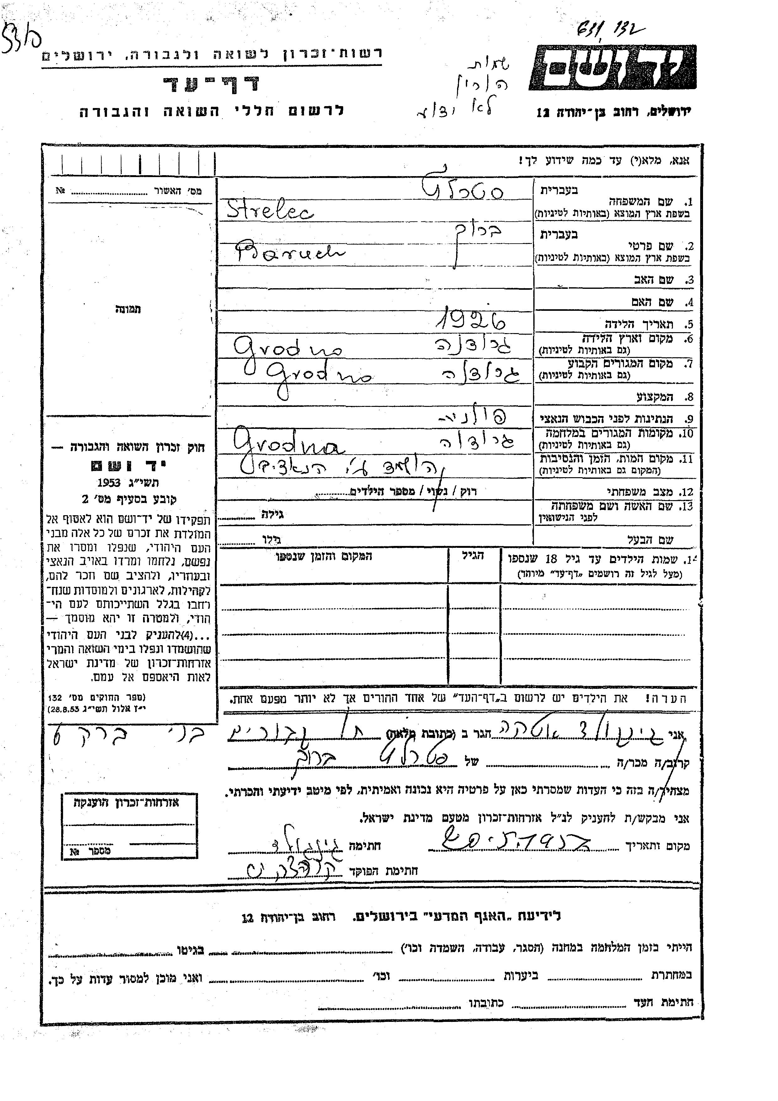 Baruch Strelec wurde im Jahr 1926 in Grodno, Polen geboren. Er war Ledig. Vor dem Zweiten Weltkrieg lebte er in Grodno, Polen. Während des Krieges war er in Grodno, Polen.