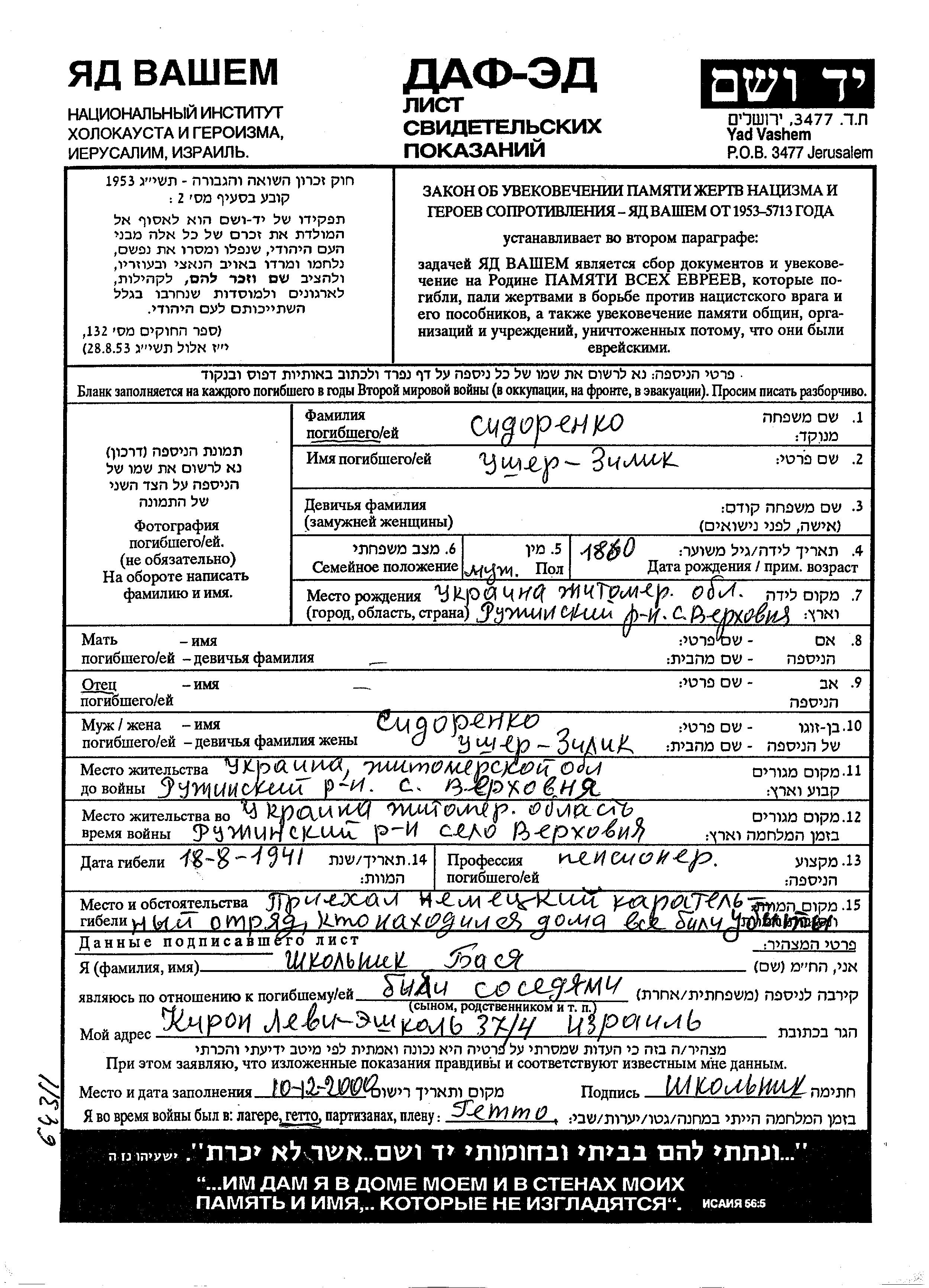 Usher Zelig Sidorenko wurde im Jahr 1860 in Verkhovnya, Ukraine (UdSSR) geboren. Er war Rentner/-in. Vor dem Zweiten Weltkrieg lebte er in Verkhovnya, Ukraine (UdSSR). Während des Krieges war er in Verkhovnya, Ukraine (UdSSR).