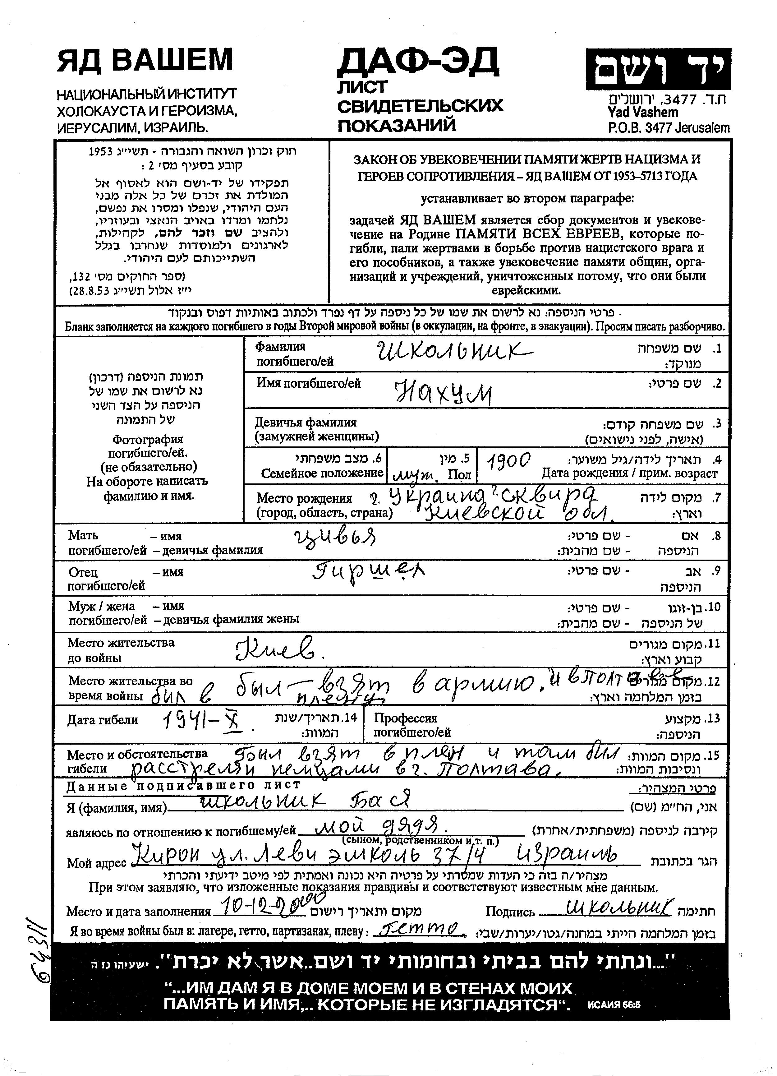 Nakhum Shkolnik wurde im Jahr 1900 in Skvira, Ukraine (UdSSR) geboren. Er war der Sohn von Girshel und Tzivya. Vor dem Zweiten Weltkrieg lebte er in Kiev, Ukraine (UdSSR). Während des Krieges war er in die Sowjetischen Streitkräfte.