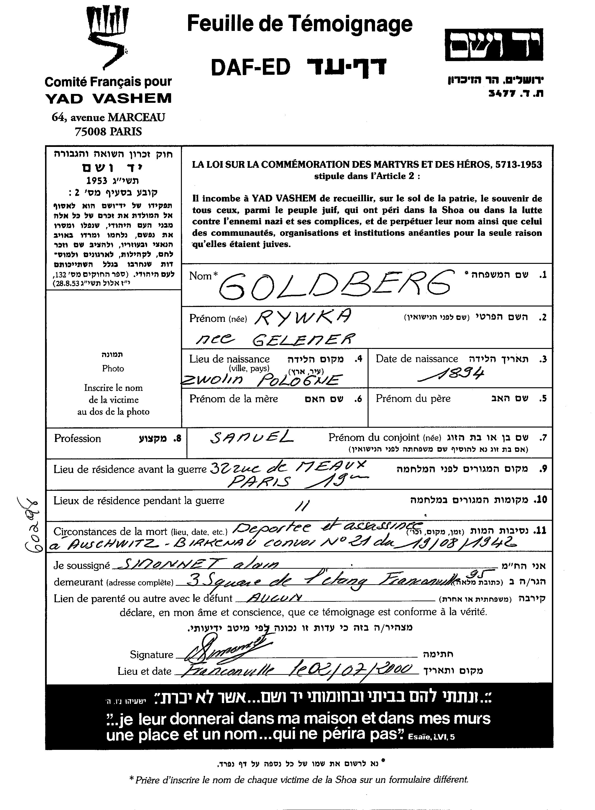 Rywka Goldberg, geb. Gelemer wurde im Jahr 1894 in Zwolen, Polen geboren. Sie war mit Samuel Verheiratet. Vor dem Zweiten Weltkrieg lebte sie in Paris, Frankreich. Während des Krieges war sie in Paris, Frankreich.