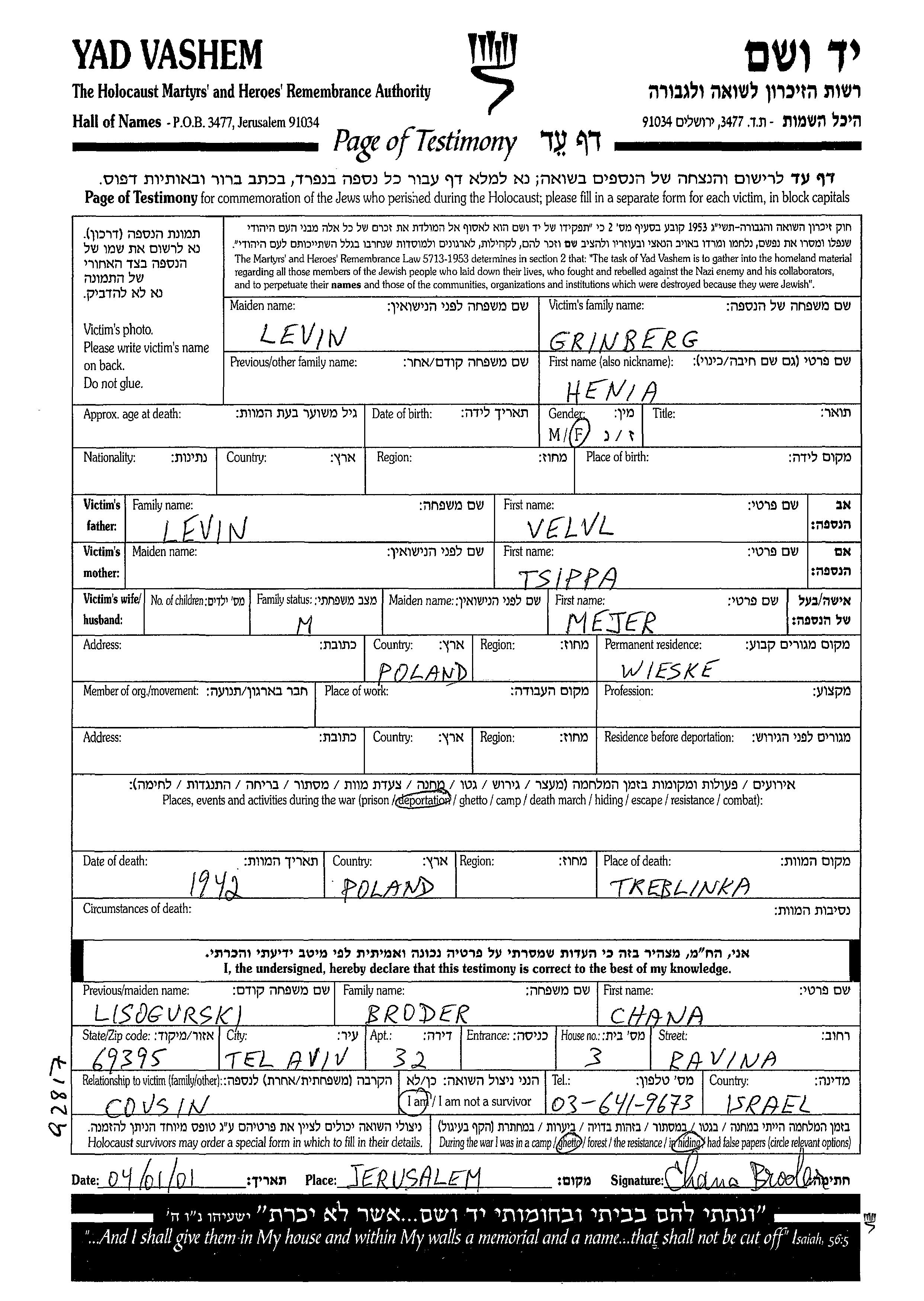 Henia Grinberg, geb. Levin wurde Sie war die Tochter von Velvl und Tsippa. Sie war mit Mejer Verheiratet. Vor dem Zweiten Weltkrieg lebte sie in Wiȩskie, Polen.