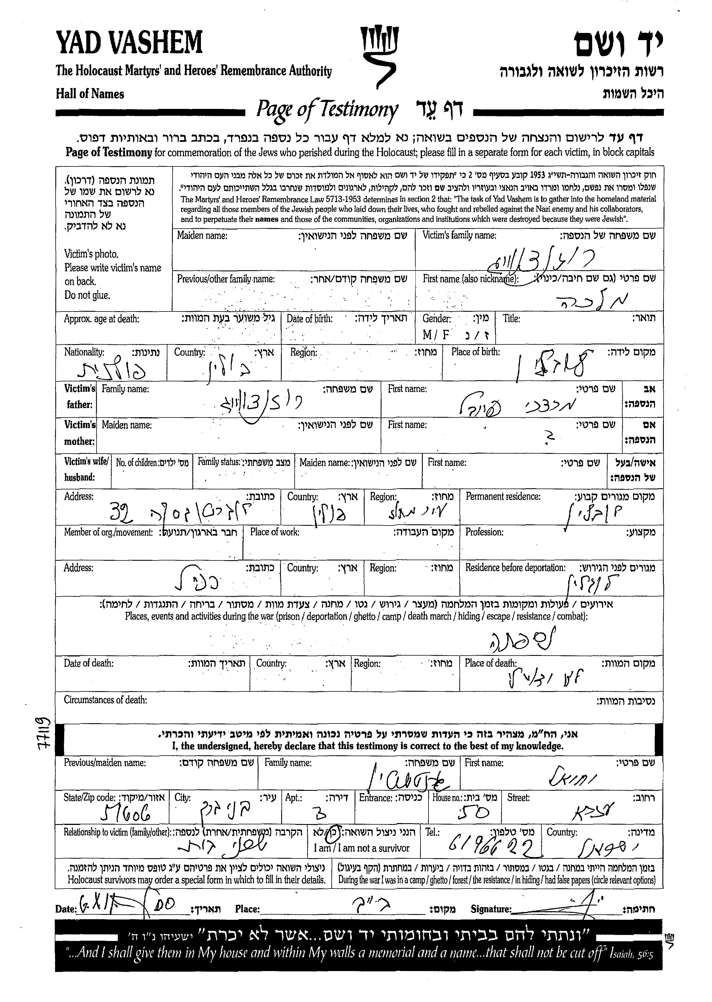 Rozentzveig Malka Lublin, Polen Gedenkblatt
