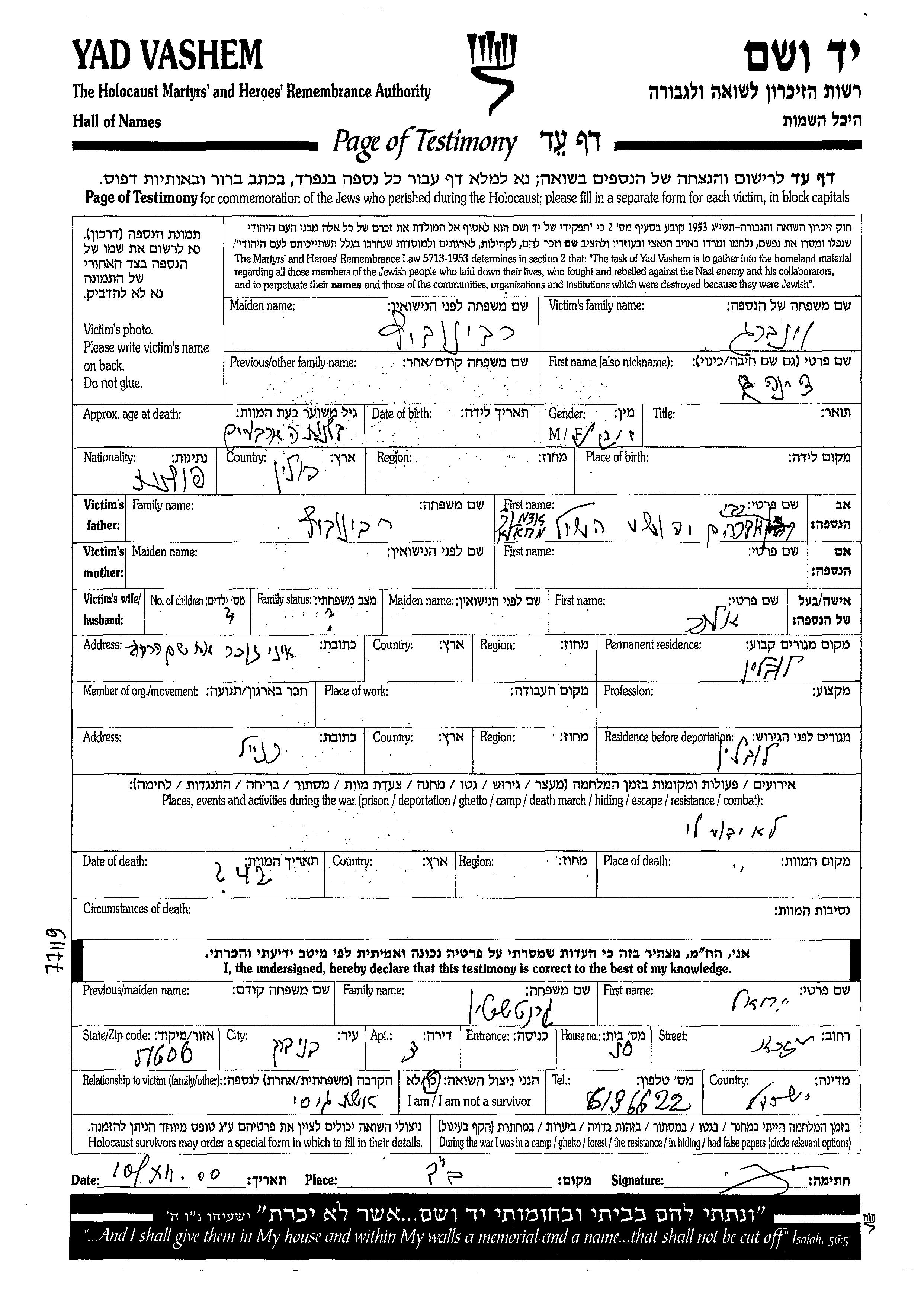 Tzina wurde in der Schoah ermordet. Todesort: Lublin, Polen im Jahr 1942.
