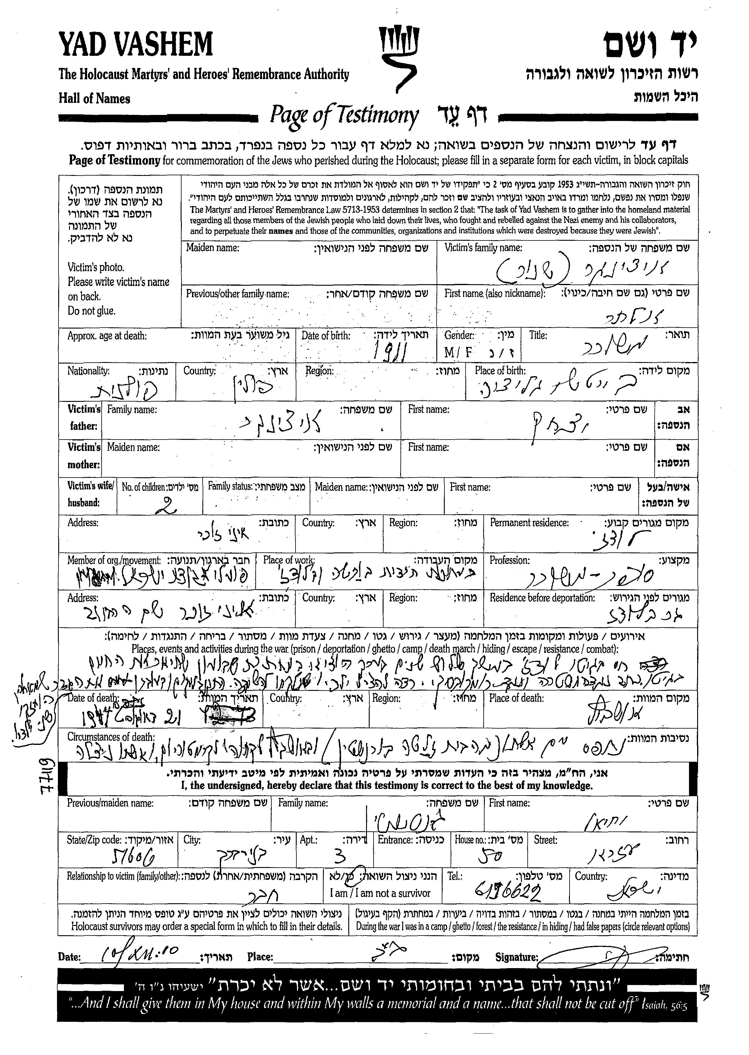 Alter wurde in der Schoah ermordet. Todesort: Auschwitz, Polen im Jahr 1944.