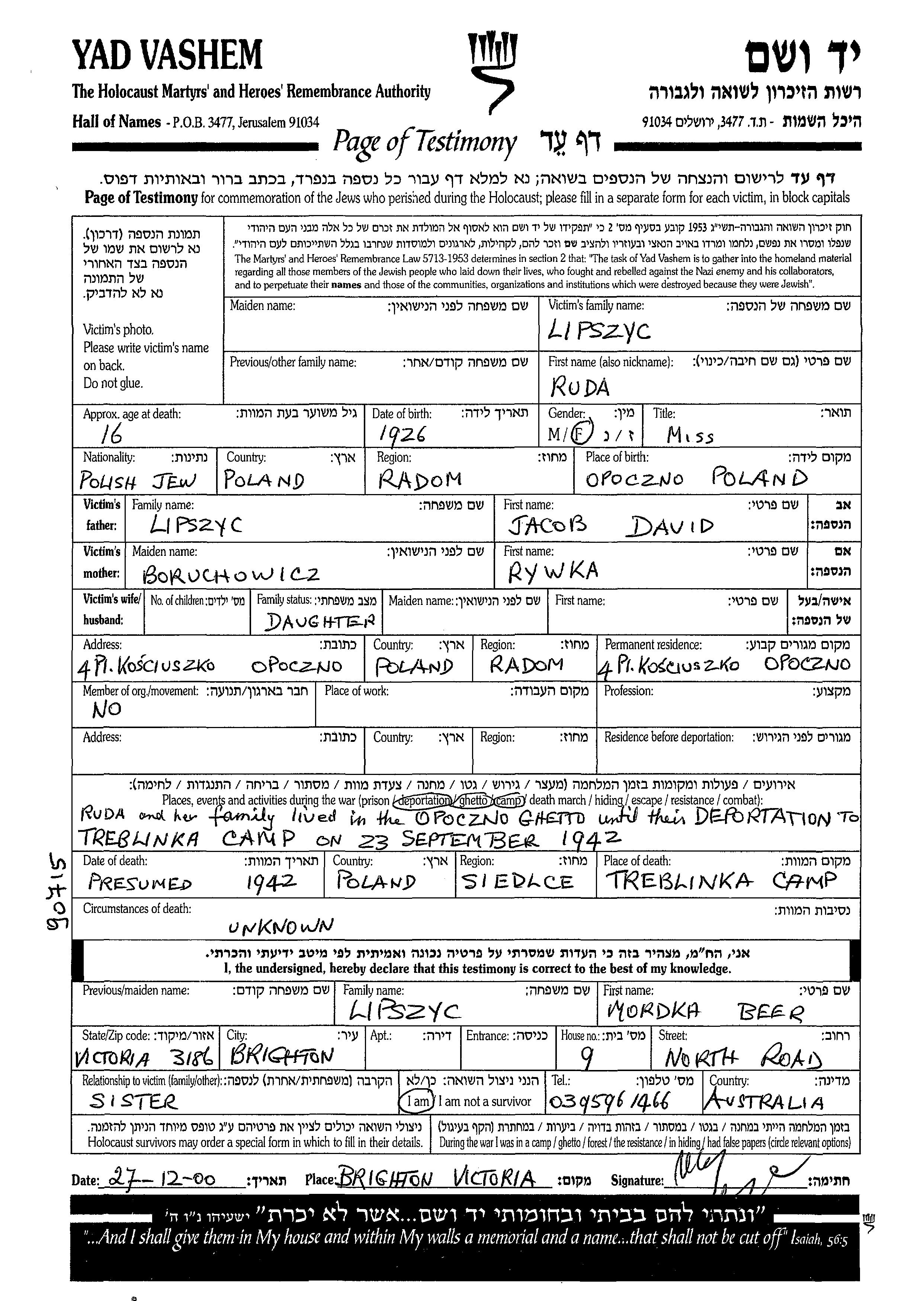 Roda Lipszyc wurde im Jahr 1926 in Opoczno, Polen geboren. Sie war die Tochter von Jacob David und Rywka. Vor dem Zweiten Weltkrieg lebte sie in Opoczno, Polen. Während des Krieges war sie in Opoczno, Polen.