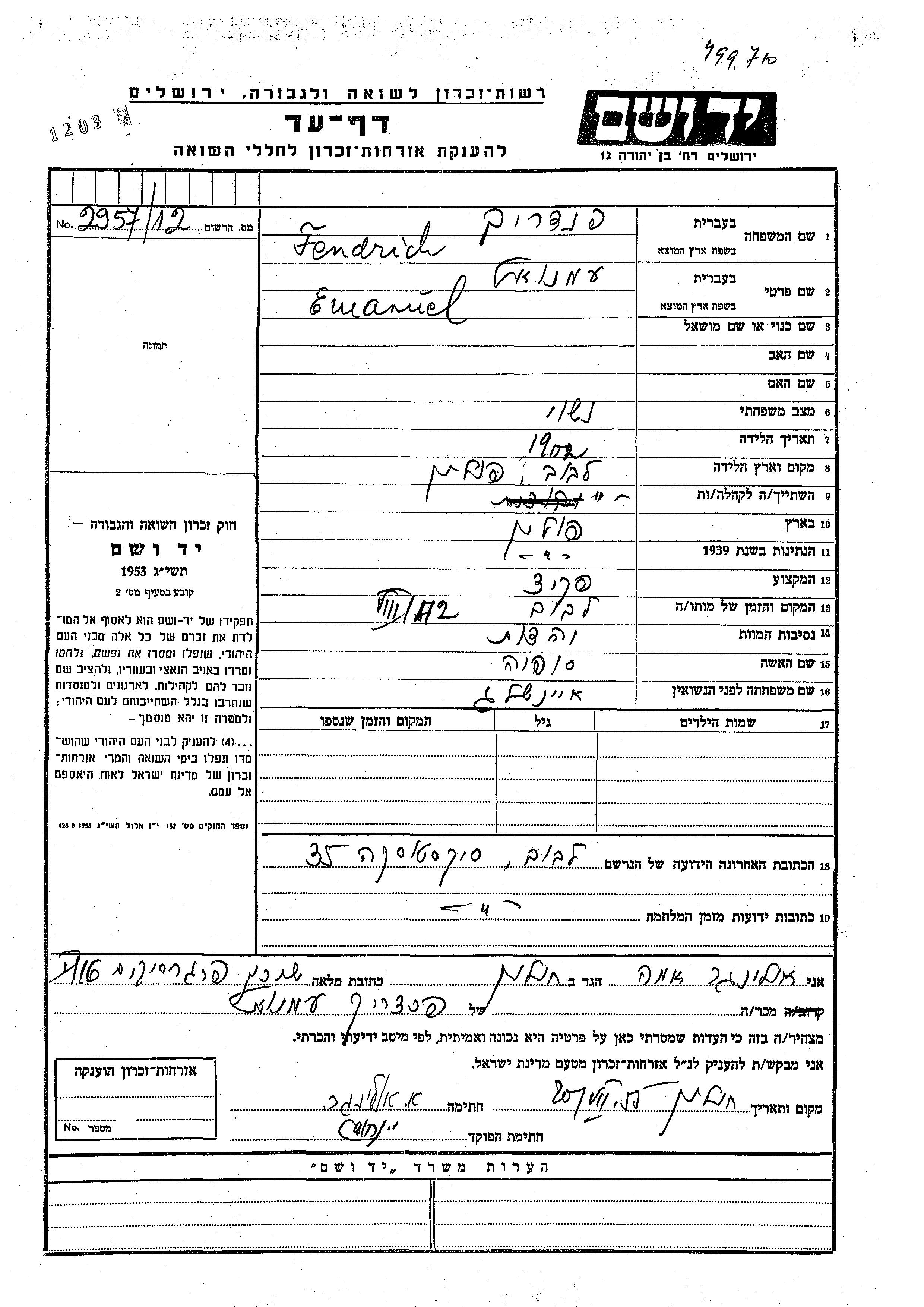 Emanuel Fendrich wurde im Jahr 1902 in Lwow, Polen geboren. Er war Angestellte/-r. Vor dem Zweiten Weltkrieg lebte er in Lwow, Polen. Während des Krieges war er in Lwow, Polen.