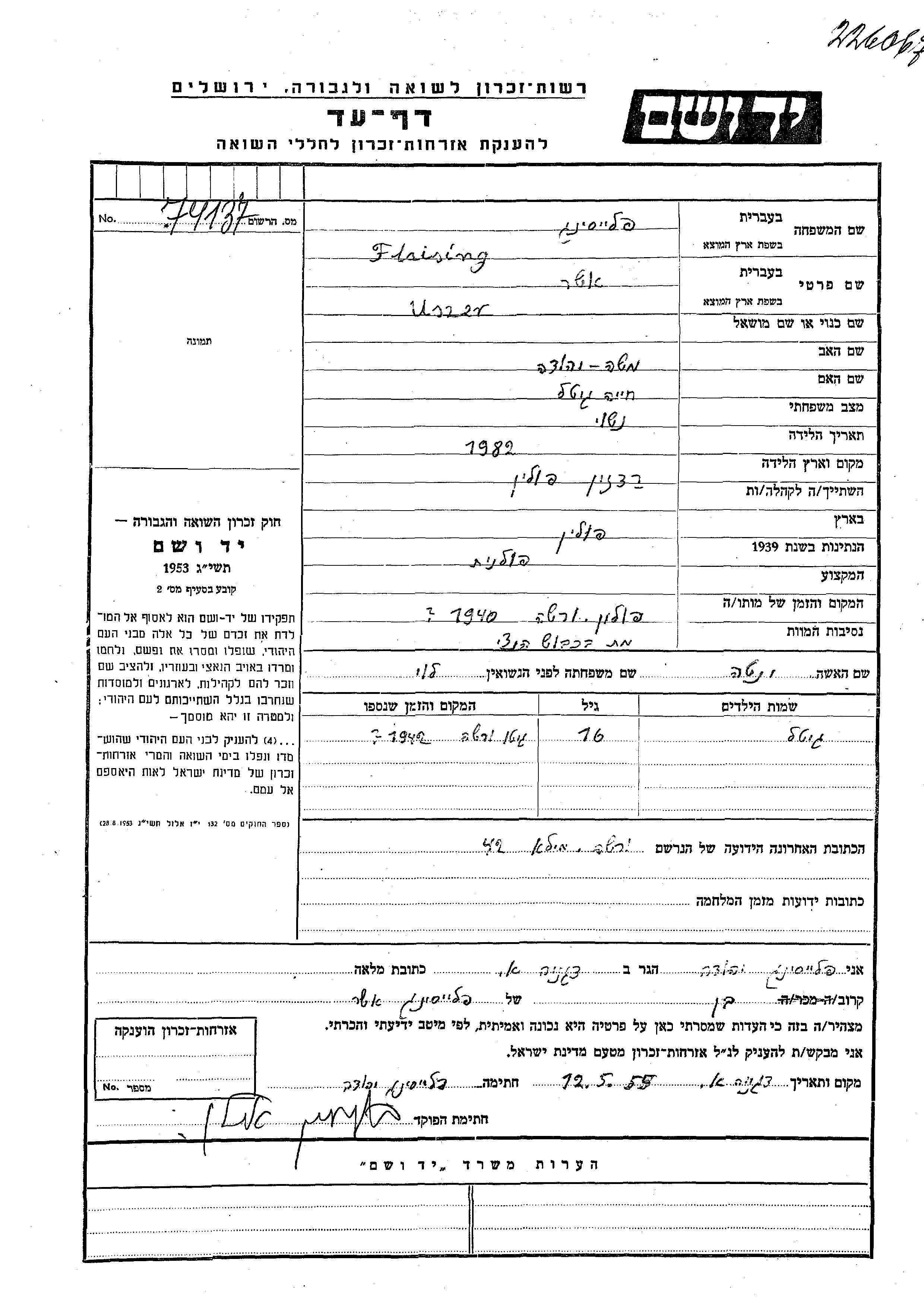 Uszer Flaising wurde im Jahr 1882 in Radzyn, Polen geboren. Er war der Sohn von Moshe Yehuda und Khaia Gitel. Er war mit Yenta, geb. Levi Verheiratet. Während des Krieges war er in Warszawa, Polen.