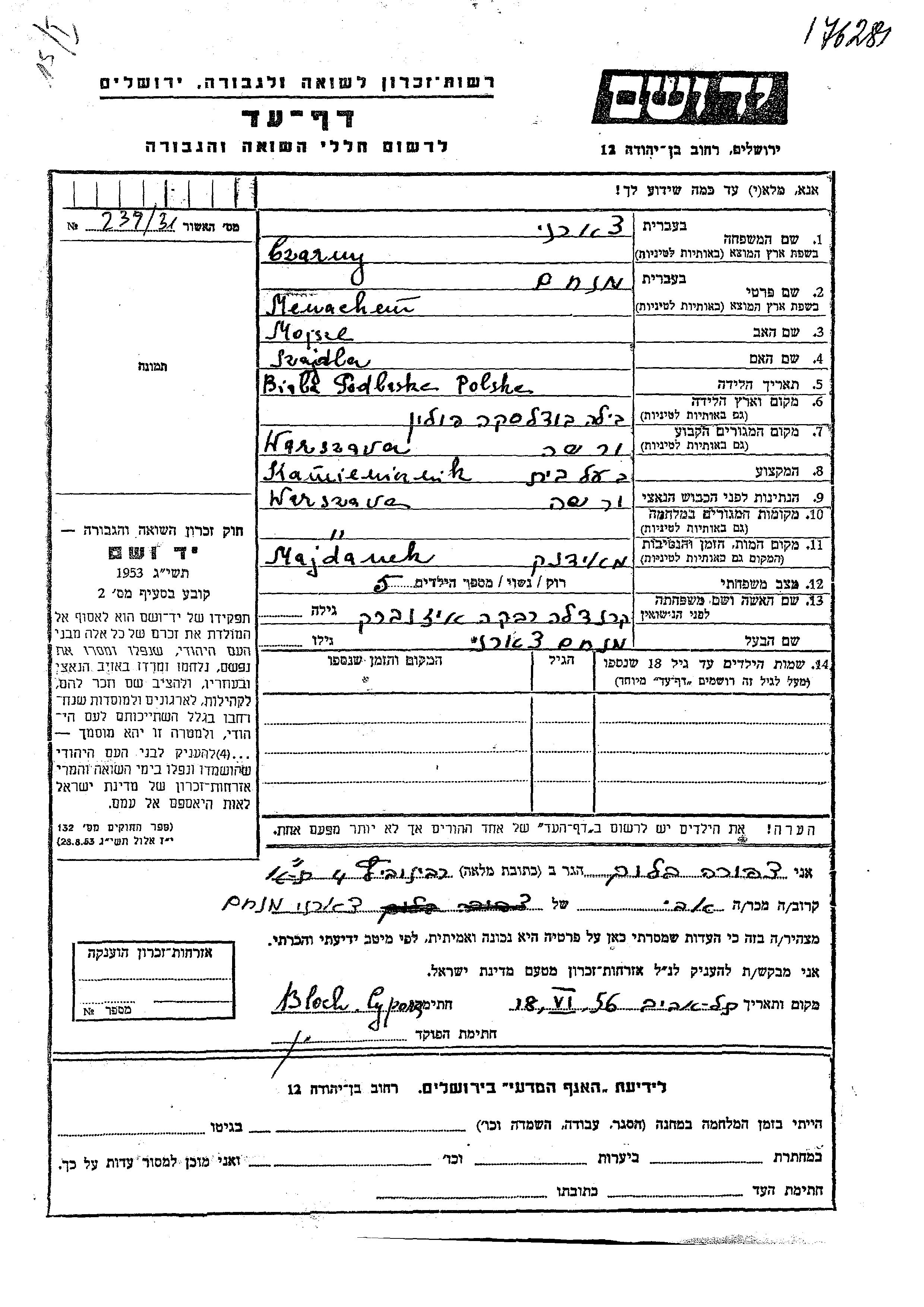 Menachem Czarny wurde in Biala Podlaska, Polen geboren. Er war der Sohn von Mojsze und Szajdla. Er war Hausbesitzer/-in und mit Kreina Rivka, geb. Eizenberg Verheiratet. Vor dem Zweiten Weltkrieg lebte er in Warszawa, Polen. Während des Krieges war er in Warszawa, Polen.