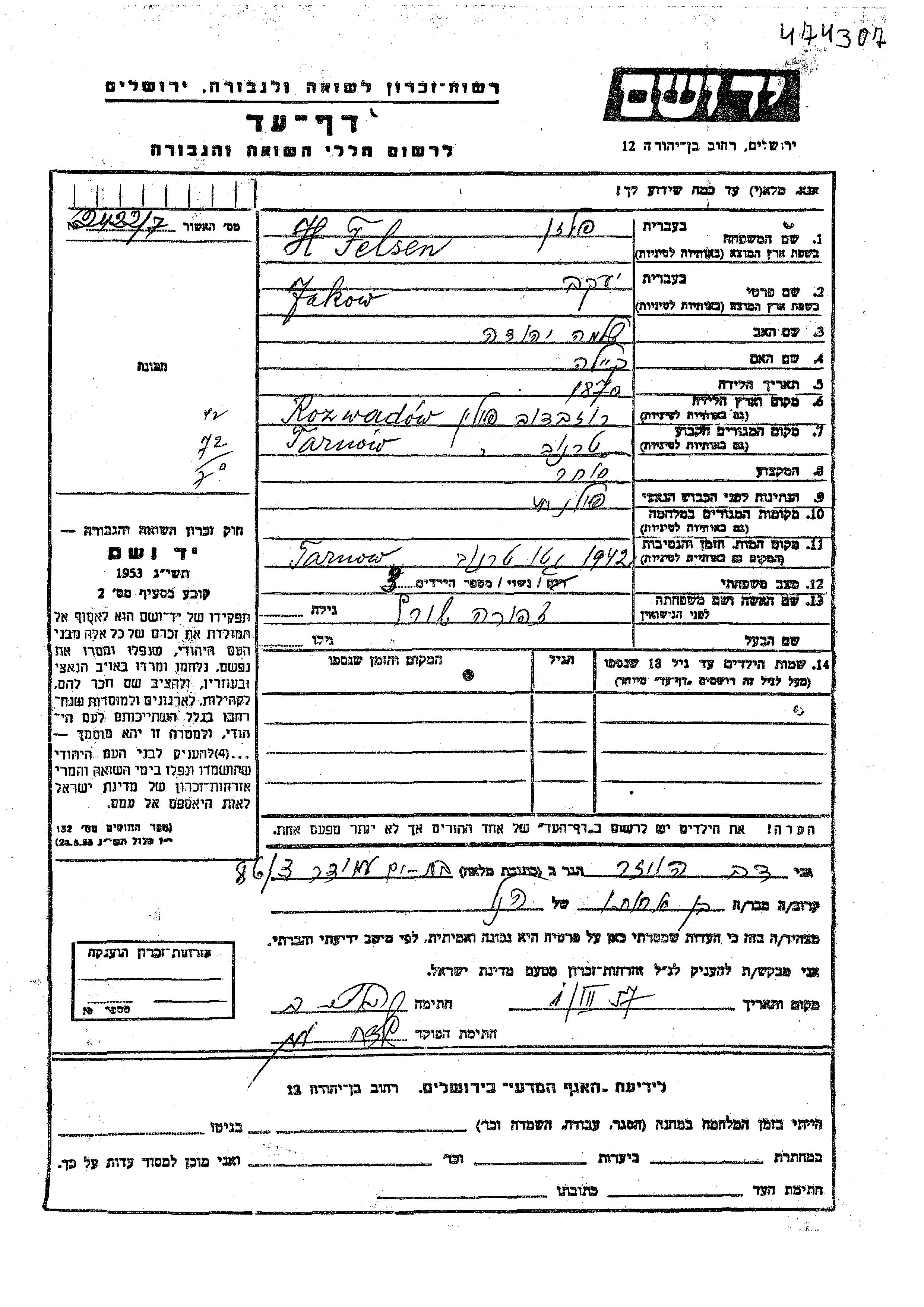Yakow wurde in der Schoah ermordet. Todesort: Tarnow, Polen im Jahr 1942.