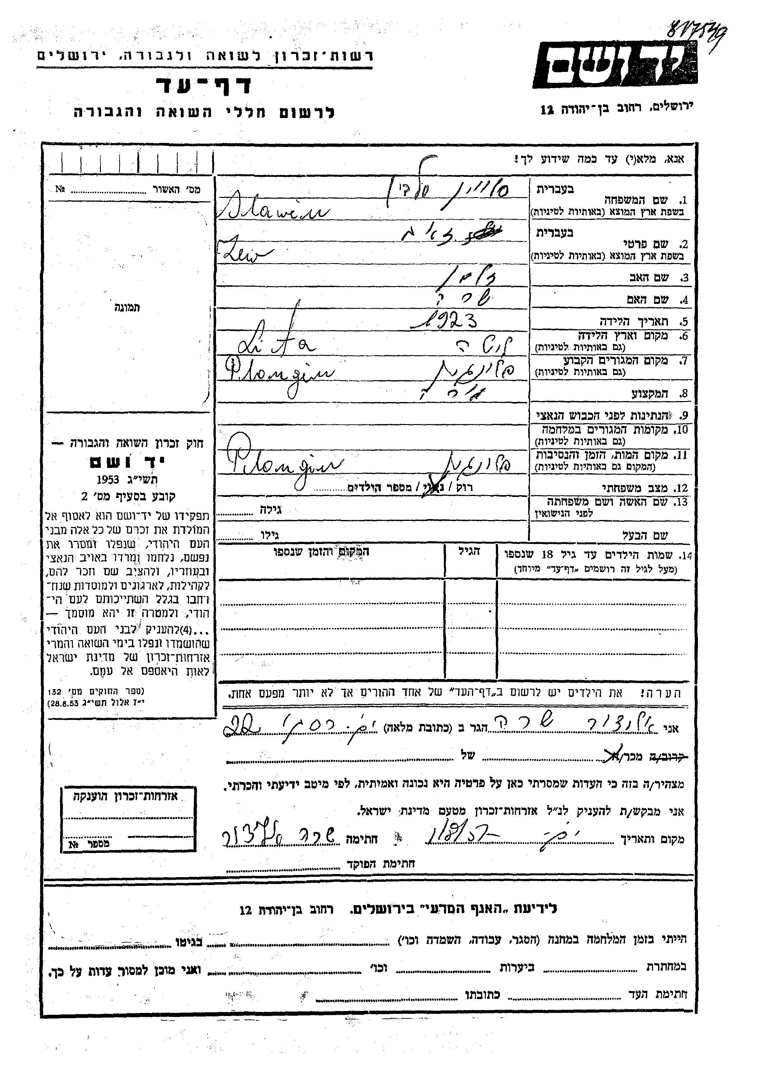 Zew Slawin wurde im Jahr 1923 in Litauen geboren. Er war der Sohn von Zalman und Sara. Er war Lehrer/in und Ledig. Vor dem Zweiten Weltkrieg lebte er in Plungian, Litauen. Während des Krieges war er in Plungian, Litauen.