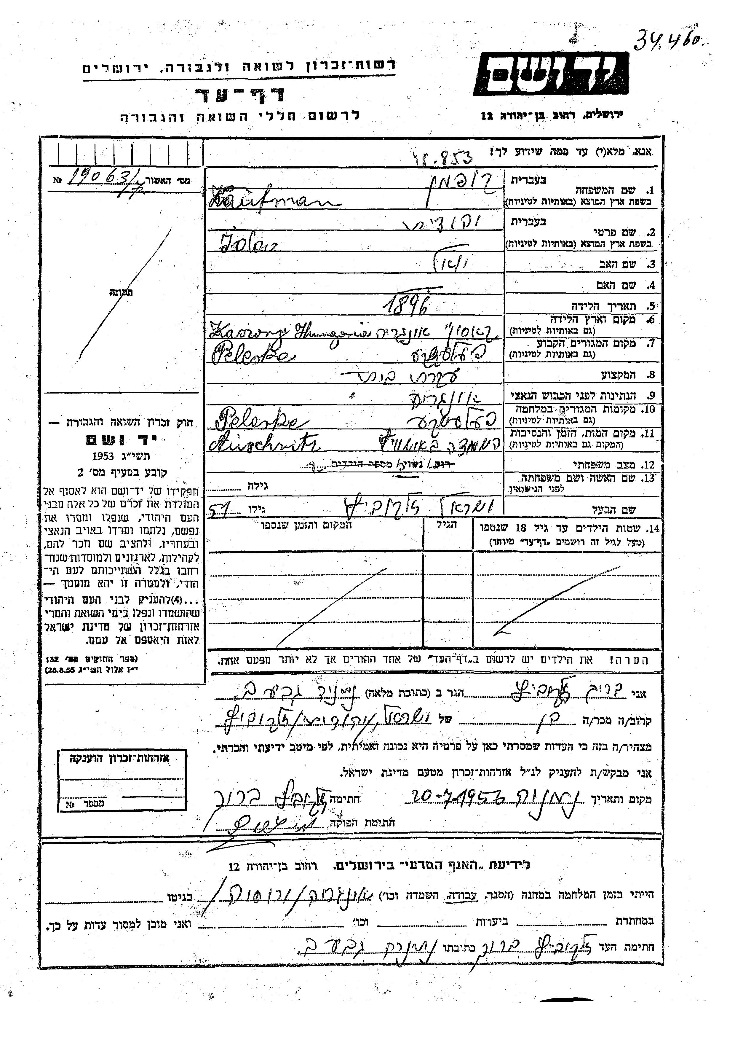 Ida Yehudit Kaufman, geb. Zelkovitz wurde im Jahr 1896 in Kaszony, Tschechoslowakei geboren. Sie war die Tochter von Yoel. Sie war Hausfrau und mit Yisrael Verheiratet. Vor dem Zweiten Weltkrieg lebte sie in Peleske, Rumänien. Während des Krieges war sie in Peleske, Rumänien.