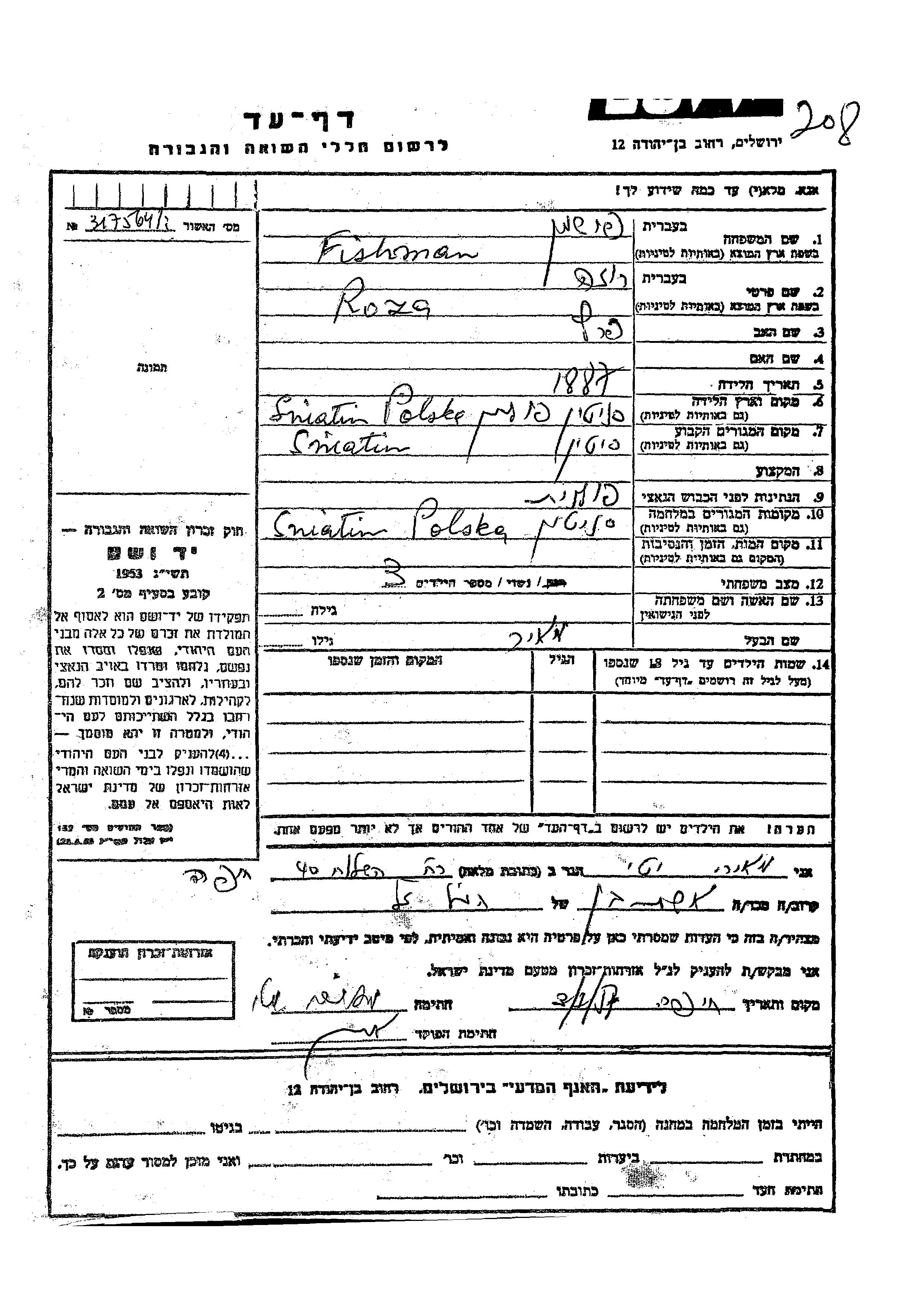 Roza Fisman wurde im Jahr 1887 in Sniatin, Polen geboren. Sie war die Tochter von Peretz. Sie war mit Meir Verheiratet. Vor dem Zweiten Weltkrieg lebte sie in Sniatin, Polen. Während des Krieges war sie in Sniatin, Polen.