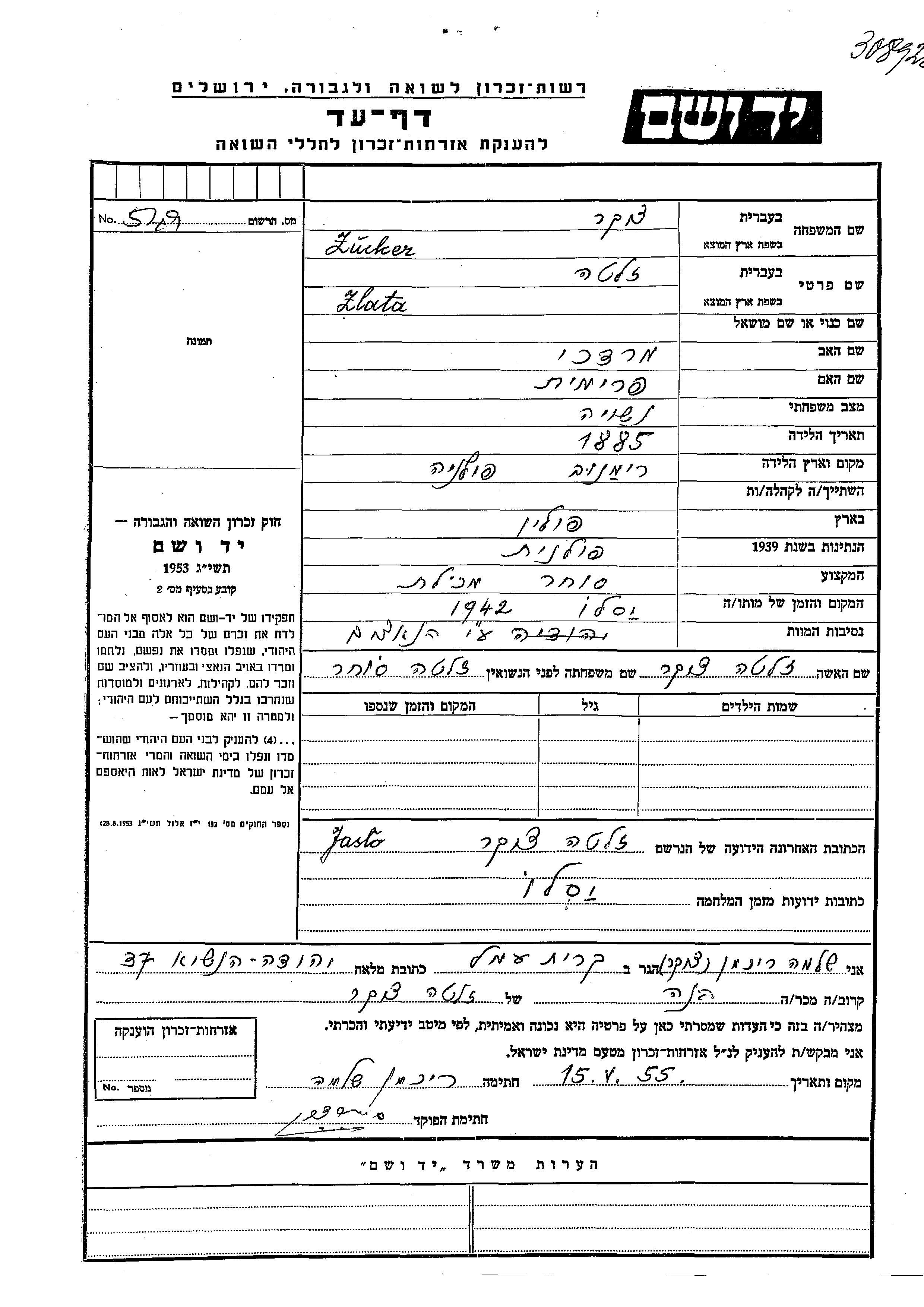 Zlata Zucker, geb. Sokher wurde im Jahr 1885 in Romanov, Polen geboren. Sie war die Tochter von Mordekhai und Frumet. Sie war Lebensmittelhändler und Verheiratet. Während des Krieges war sie in Yaslo, Polen.