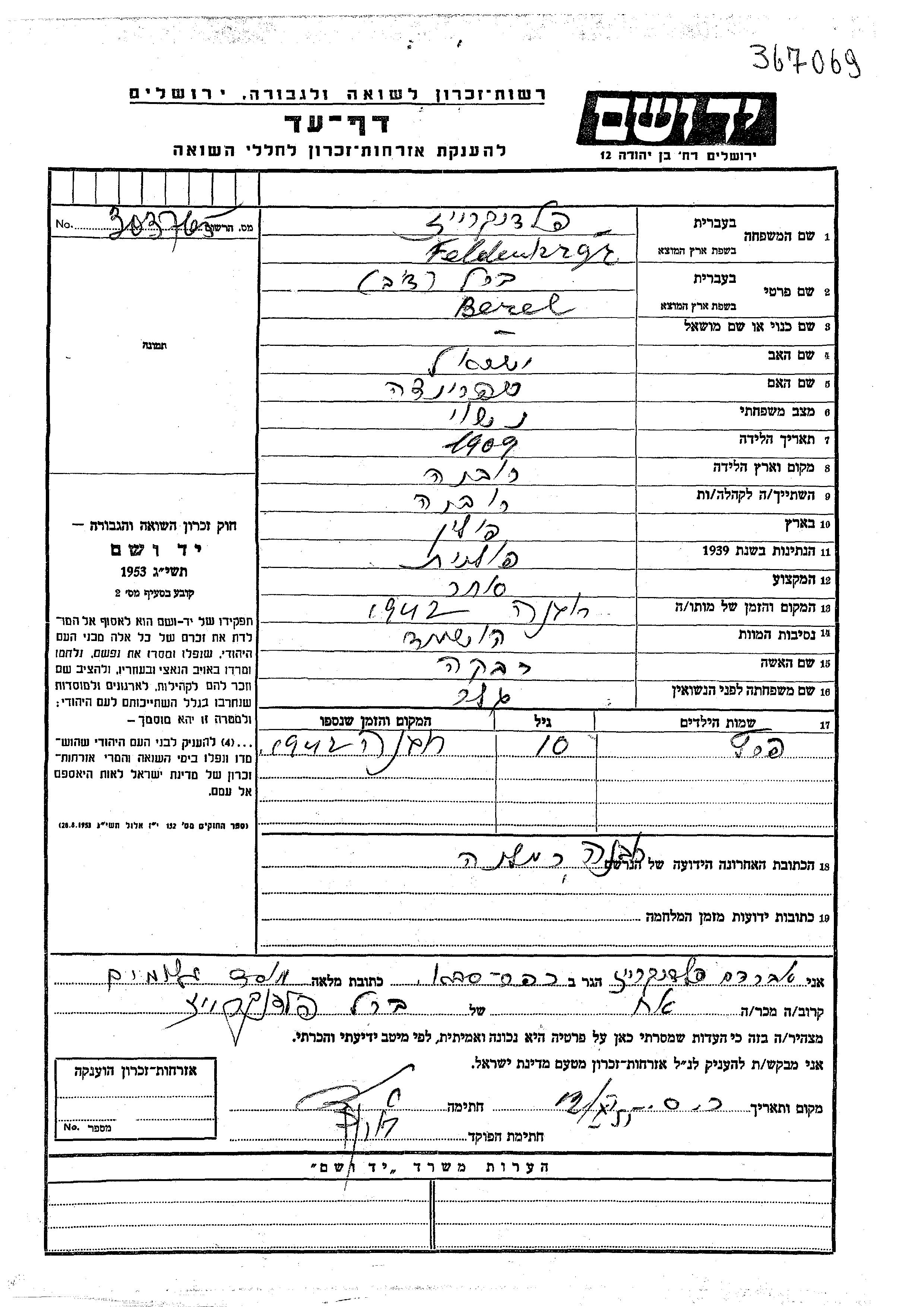 Berl Dov Feldenkreis wurde im Jahr 1909 in Rowne, Polen geboren. Er war der Sohn von Yisrael und Shprintza. Er war Kaufmann/-frau und mit Rivka, geb. Geler Verheiratet. Während des Krieges war er in Rowne, Polen.