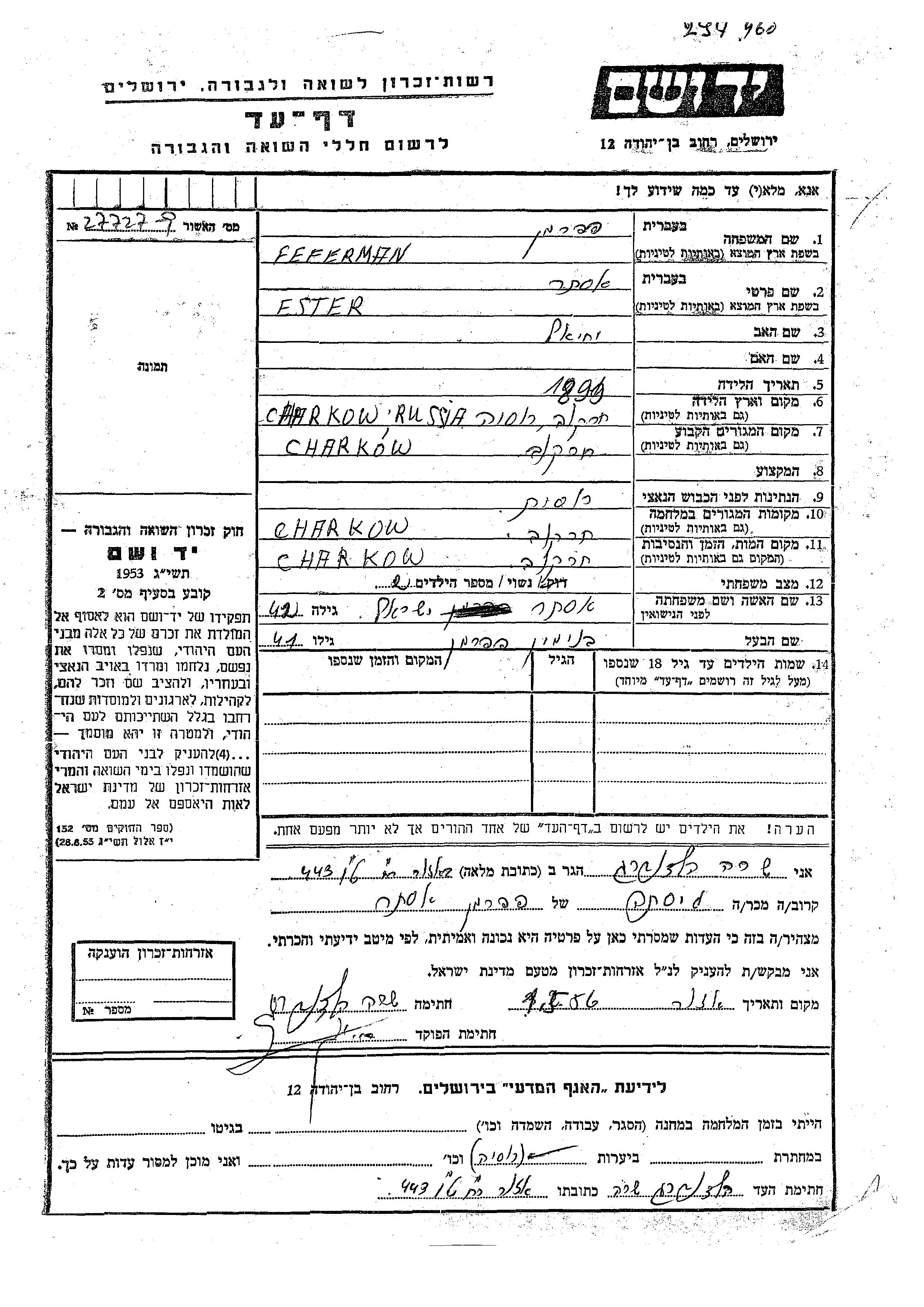 Ester Feferman, geb. Israel wurde im Jahr 1899 in Charkow, Ukraine (UdSSR) geboren. Sie war die Tochter von Yekhiel. Sie war mit Beniamin Verheiratet. Vor dem Zweiten Weltkrieg lebte sie in Charkow, Ukraine (UdSSR). Während des Krieges war sie in Charkow, Ukraine (UdSSR).