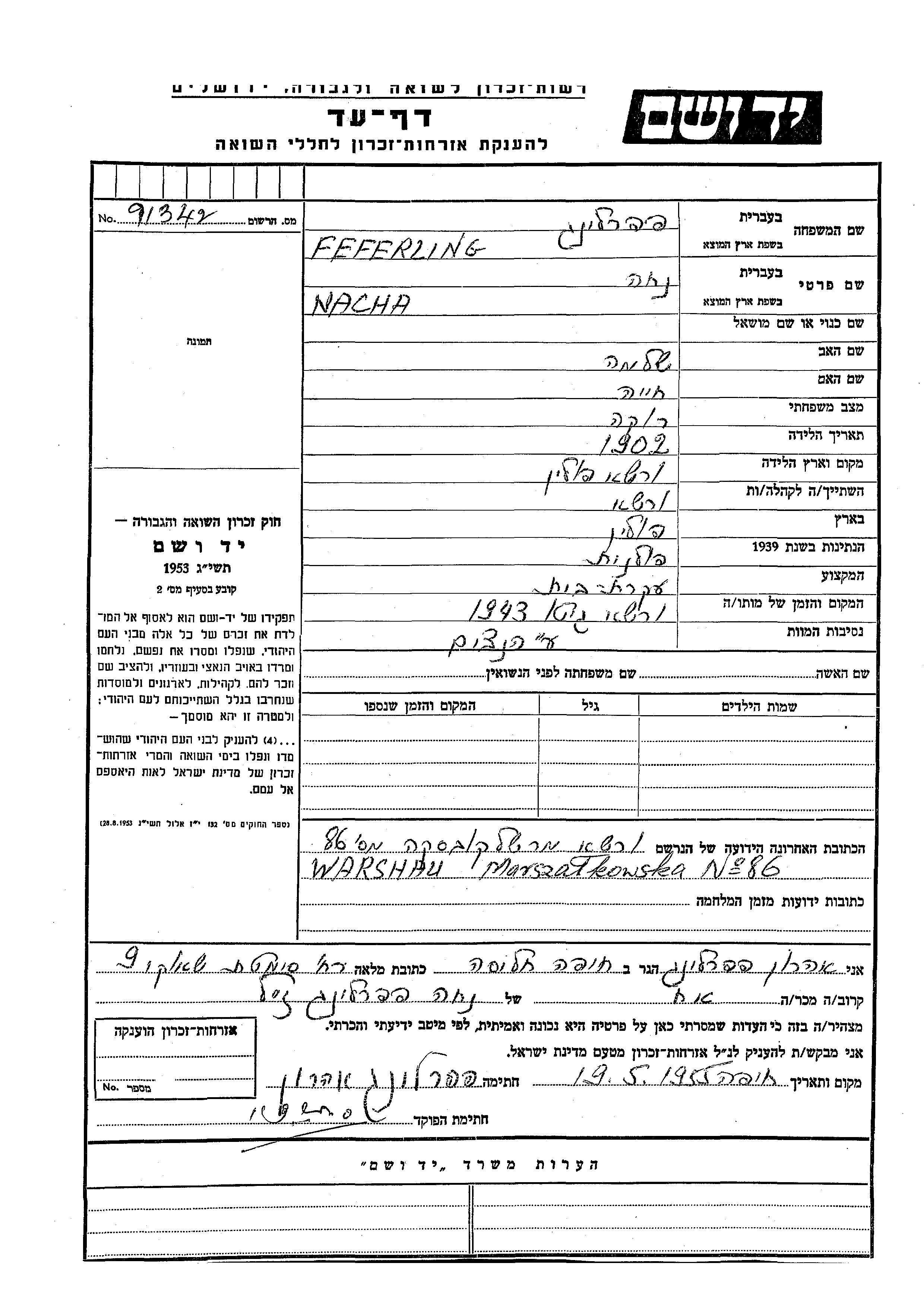 Nacha Feferling wurde im Jahr 1902 in Warsaw, Polen geboren. Sie war die Tochter von Shlomo und Khaia. Sie war Hausfrau. Während des Krieges war sie in Warsaw, Polen.