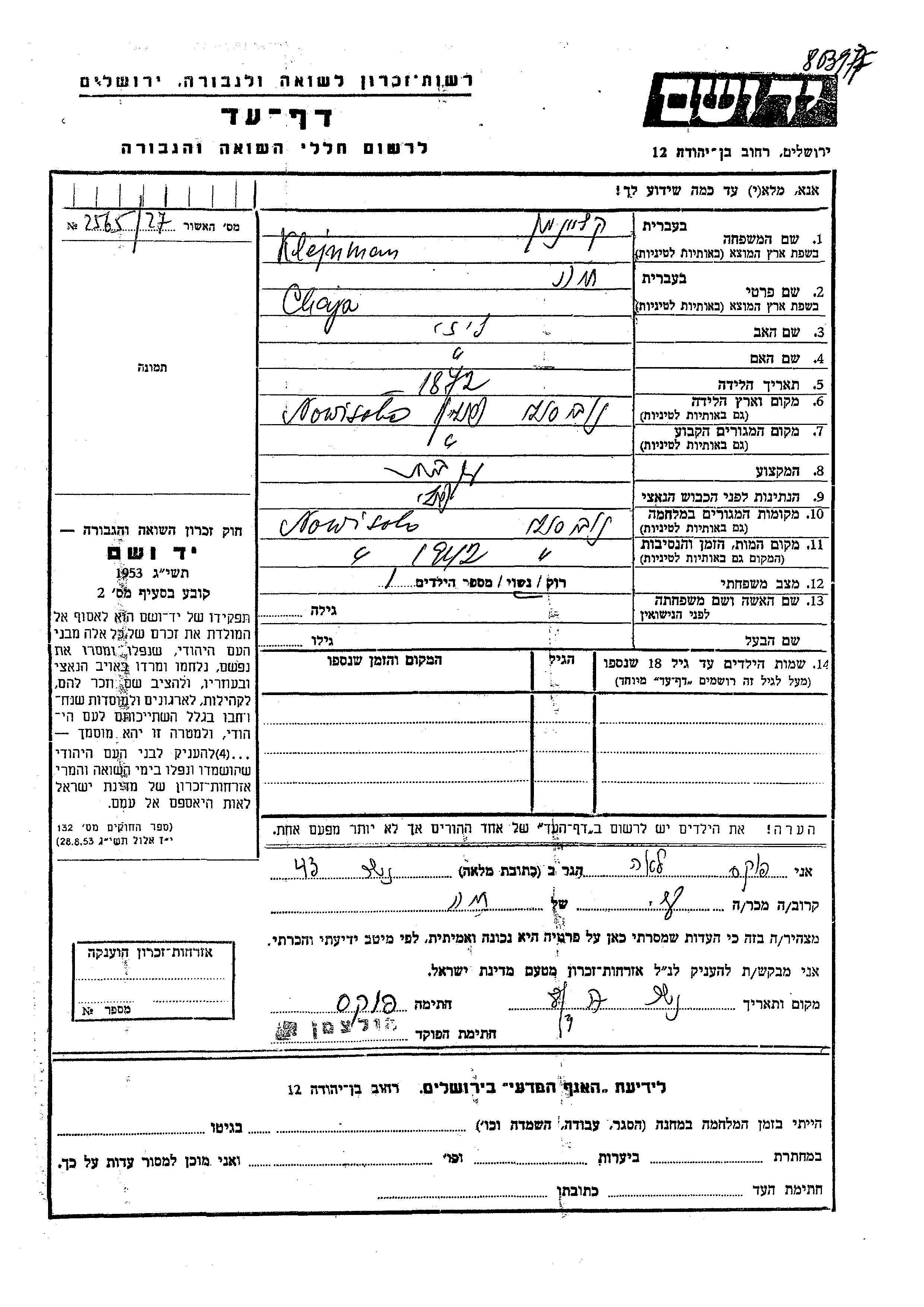Chaja Klejnman wurde im Jahr 1872 in Nowisolo, Polen geboren. Sie war Hausfrau und Verheiratet. Vor dem Zweiten Weltkrieg lebte sie in Nowisolo, Polen. Während des Krieges war sie in Nowisolo, Polen.