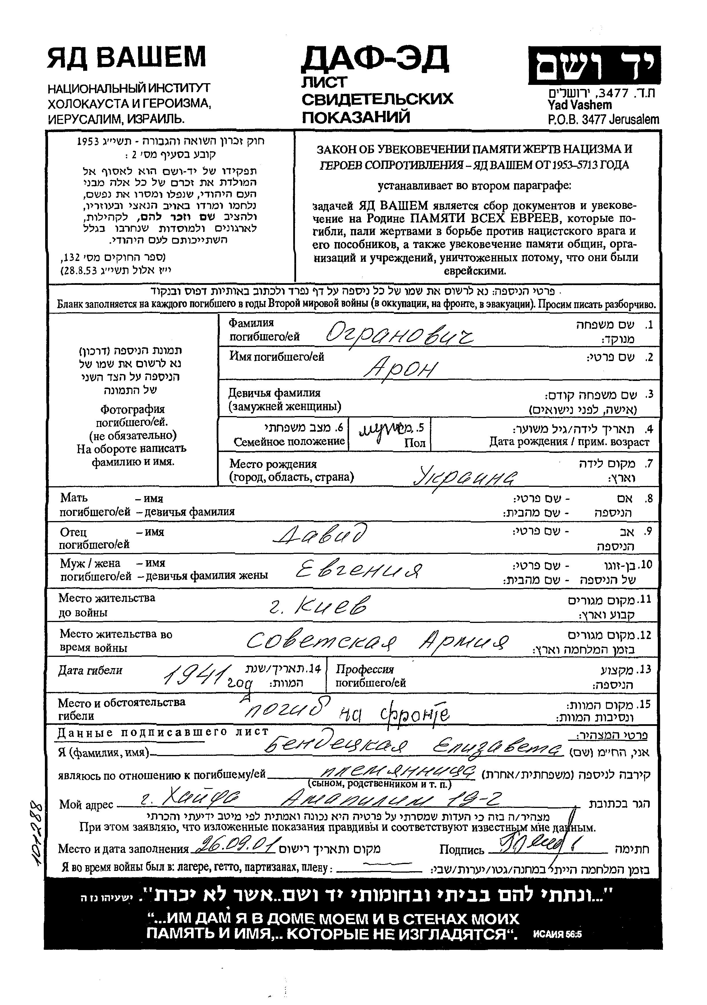 Aron Ogranovich wurde in Ukraine (UdSSR) geboren. Er war der Sohn von David. Vor dem Zweiten Weltkrieg lebte er in Kiyev, Ukraine (UdSSR). Während des Krieges war er in die Sowjetischen Streitkräfte.