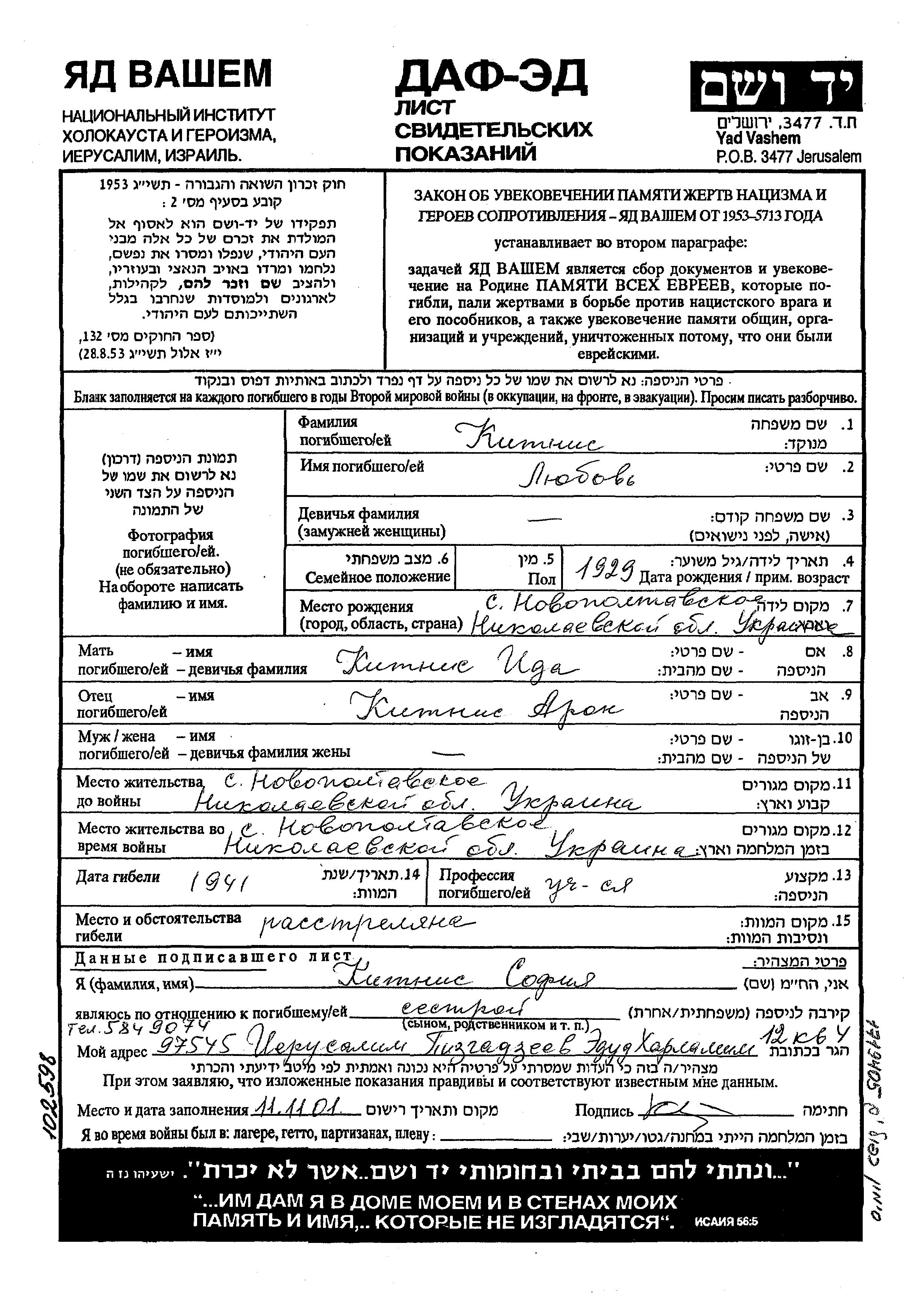 Kitnis Lyubov 1929 Novo Poltavka, Ukraine (UdSSR) Gedenkblatt