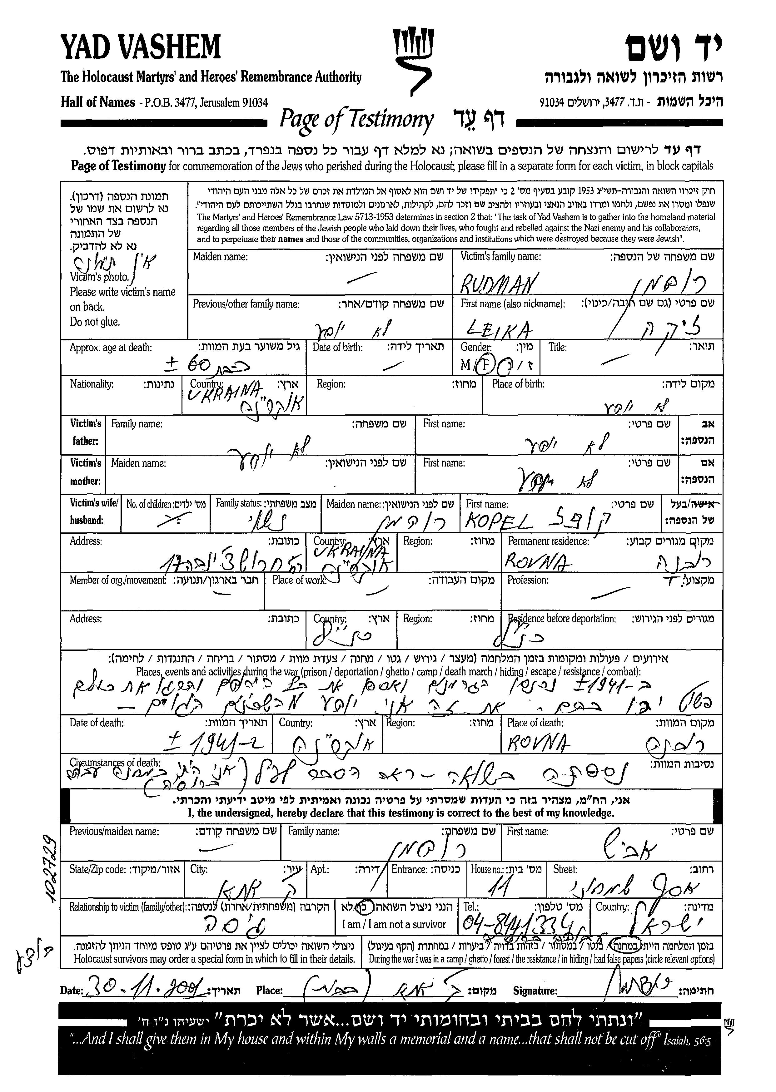 Leika Lika Rudman wurde in Ukraine (UdSSR) geboren. Sie war mit Kopel Verheiratet. Vor dem Zweiten Weltkrieg lebte sie in Rovna, Polen. Während des Krieges war sie in Rovna, Polen.