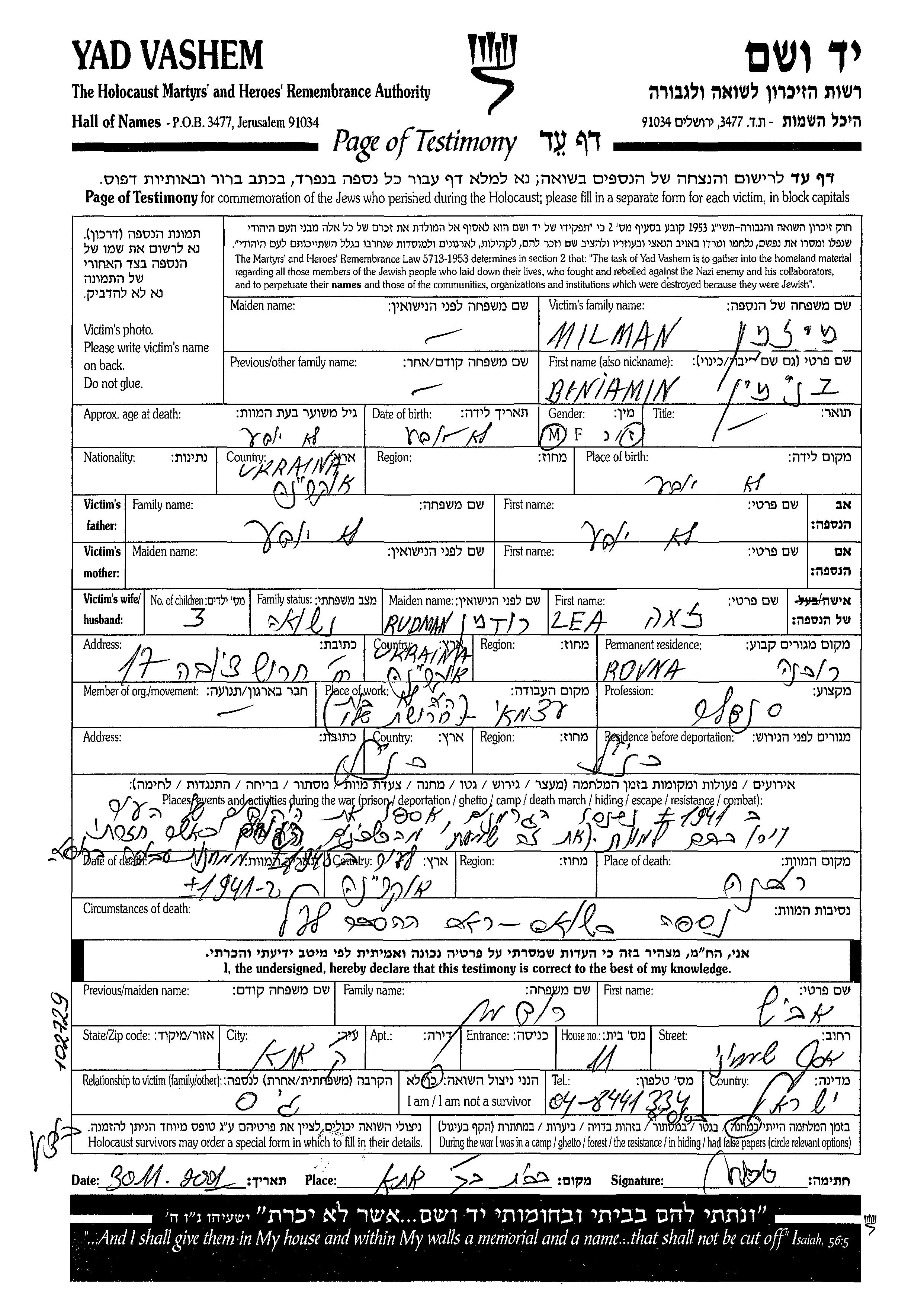 Biniamin Milman wurde in Ukraine (UdSSR) geboren. Er war Schuster/-in und mit Lea, geb. Rodman Verheiratet. Vor dem Zweiten Weltkrieg lebte er in Rovna, Polen. Während des Krieges war er in Rovna, Polen.