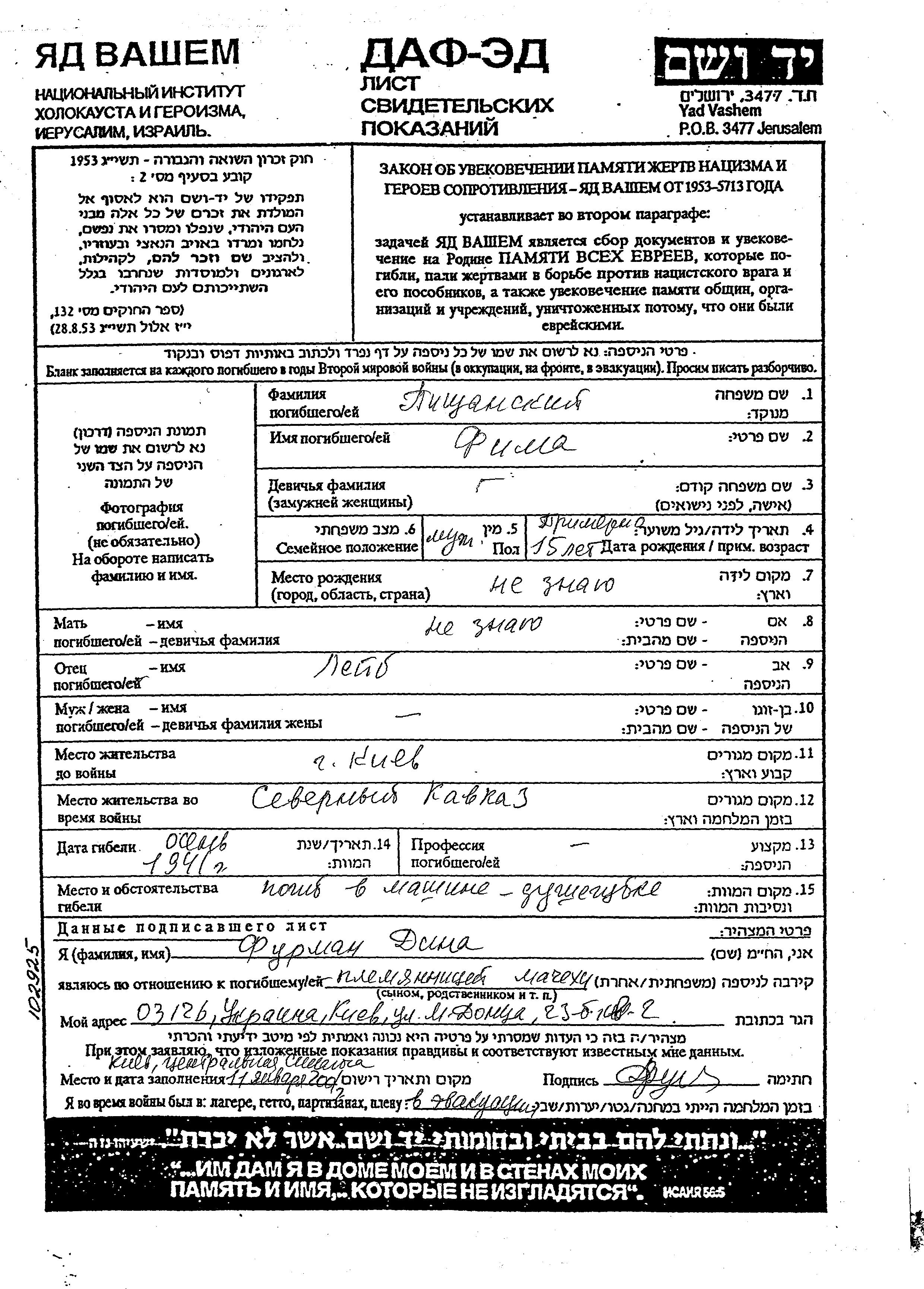 Fima Pishchanski wurde Er war der Sohn von Leib. Vor dem Zweiten Weltkrieg lebte er in Kiev, Ukraine (UdSSR). Während des Krieges war er in Caucasus Region, Russland (UdSSR).