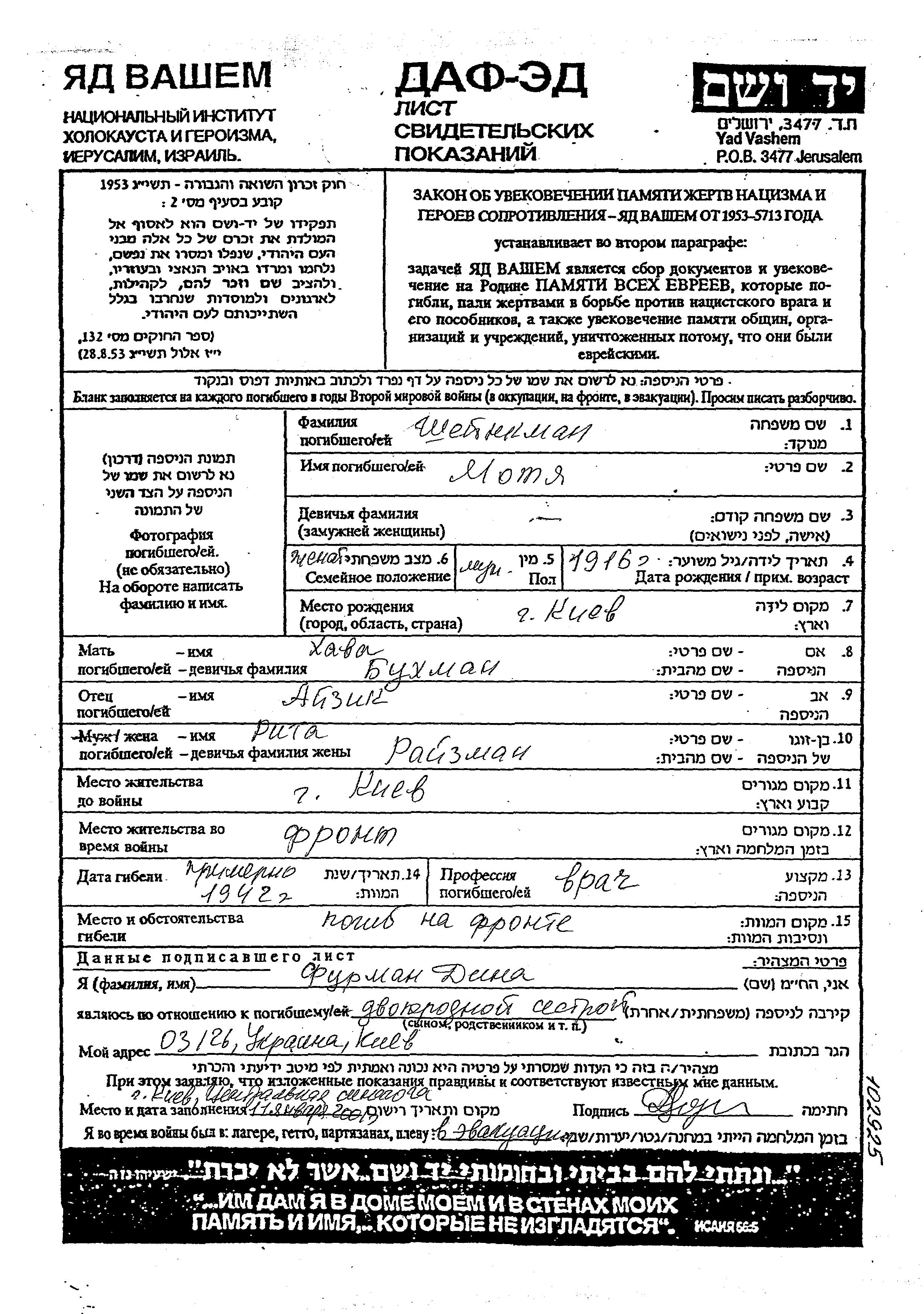 Motya Sheinkman wurde im Jahr 1916 in Kiev, Ukraine (UdSSR) geboren. Er war der Sohn von Aizik und Khava. Er war Arzt/ärztin und mit Rita, geb. Raizman Verheiratet. Vor dem Zweiten Weltkrieg lebte er in Kiev, Ukraine (UdSSR). Während des Krieges war er in die Sowjetischen Streitkräfte.