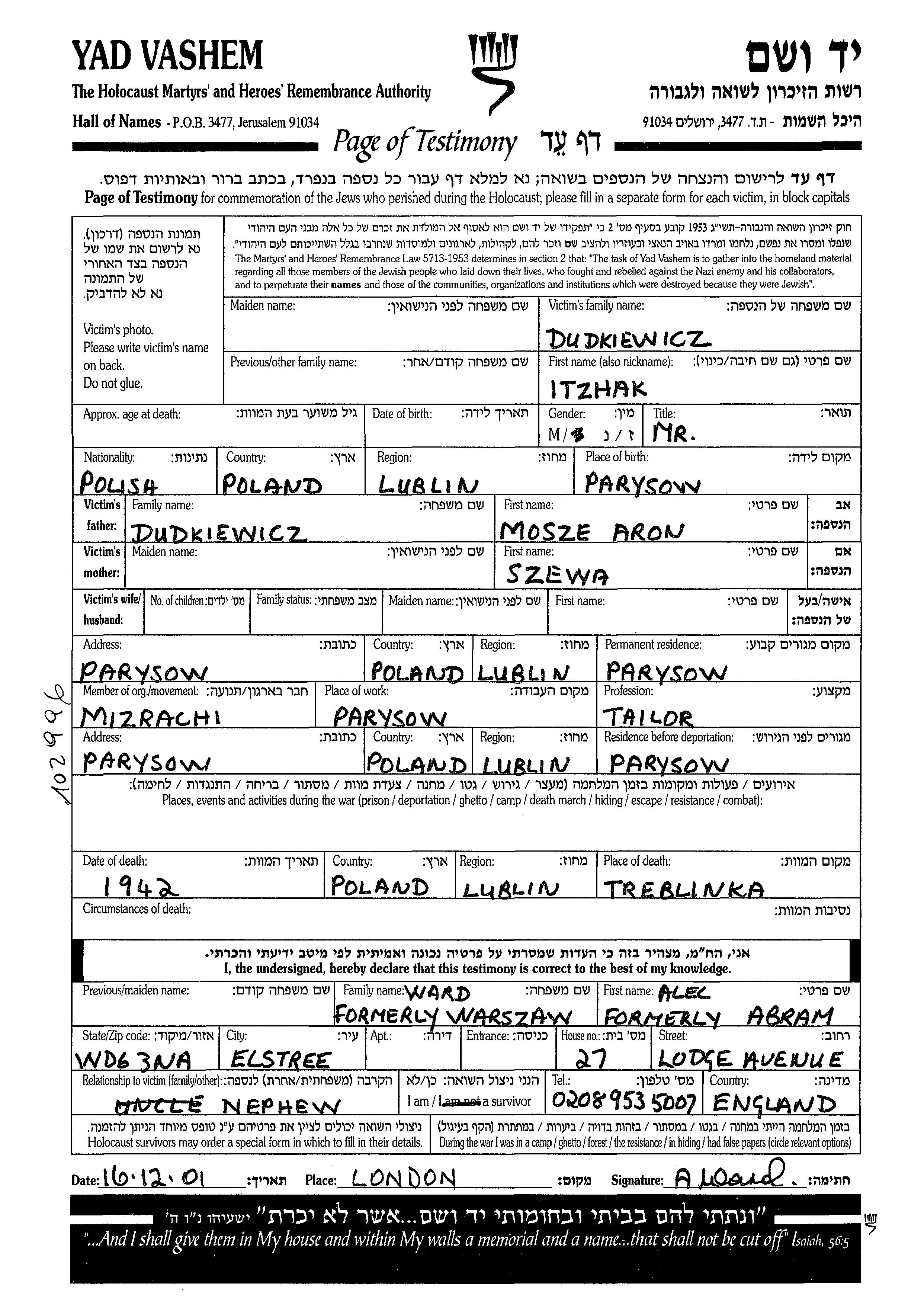 Itzhak Dudkiewicz wurde in Parysow, Polen geboren. Er war der Sohn von Mosze Aron und Szewa. Er war Schneider. Vor dem Zweiten Weltkrieg lebte er in Parysow, Polen. Während des Krieges war er in Parysow, Polen.
