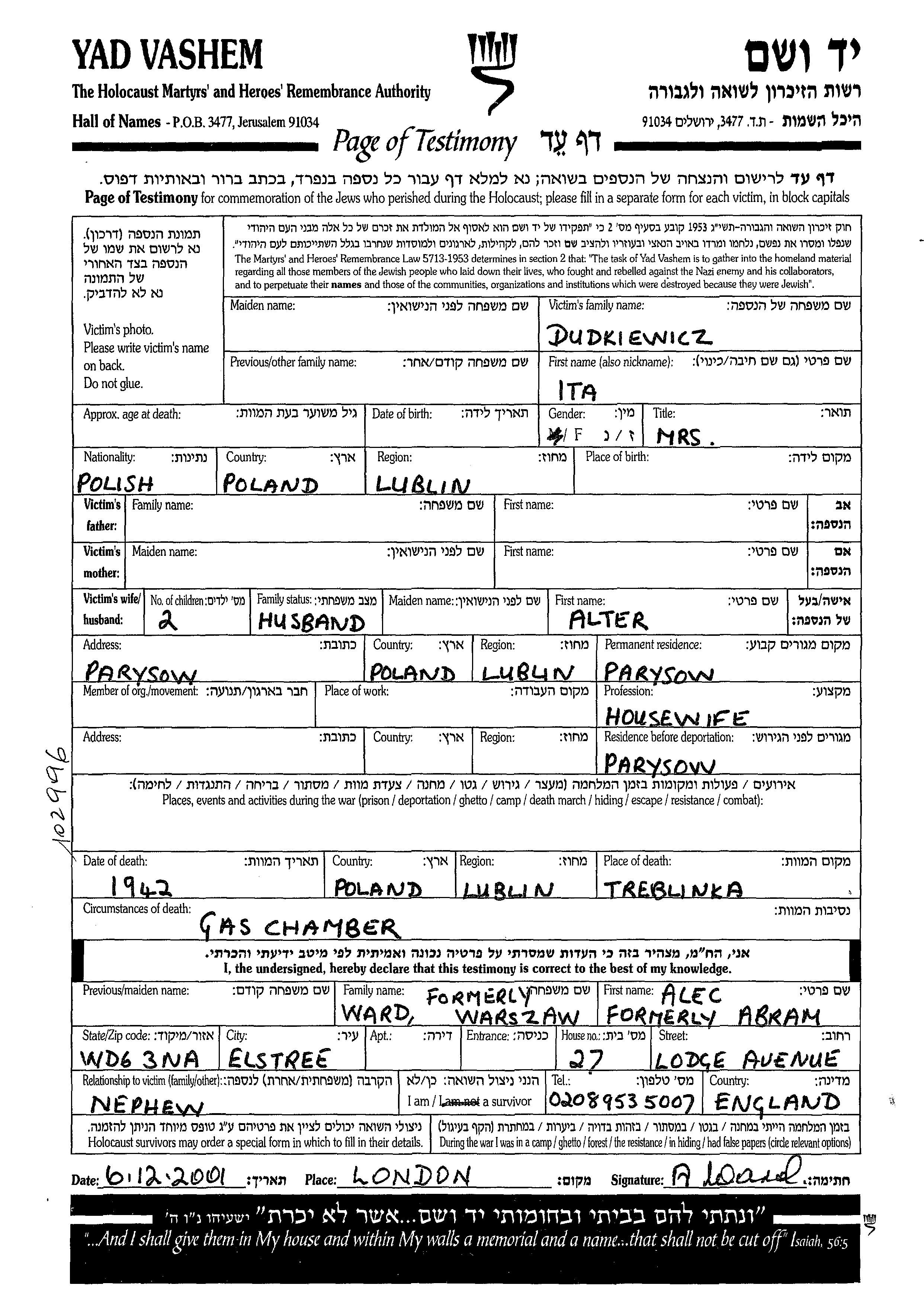 Ita Dudkiewicz wurde in Lublin, Polen geboren. Sie war Hausfrau und mit Alter Verheiratet. Vor dem Zweiten Weltkrieg lebte sie in Parysow, Polen. Während des Krieges war sie in Parysow, Polen.