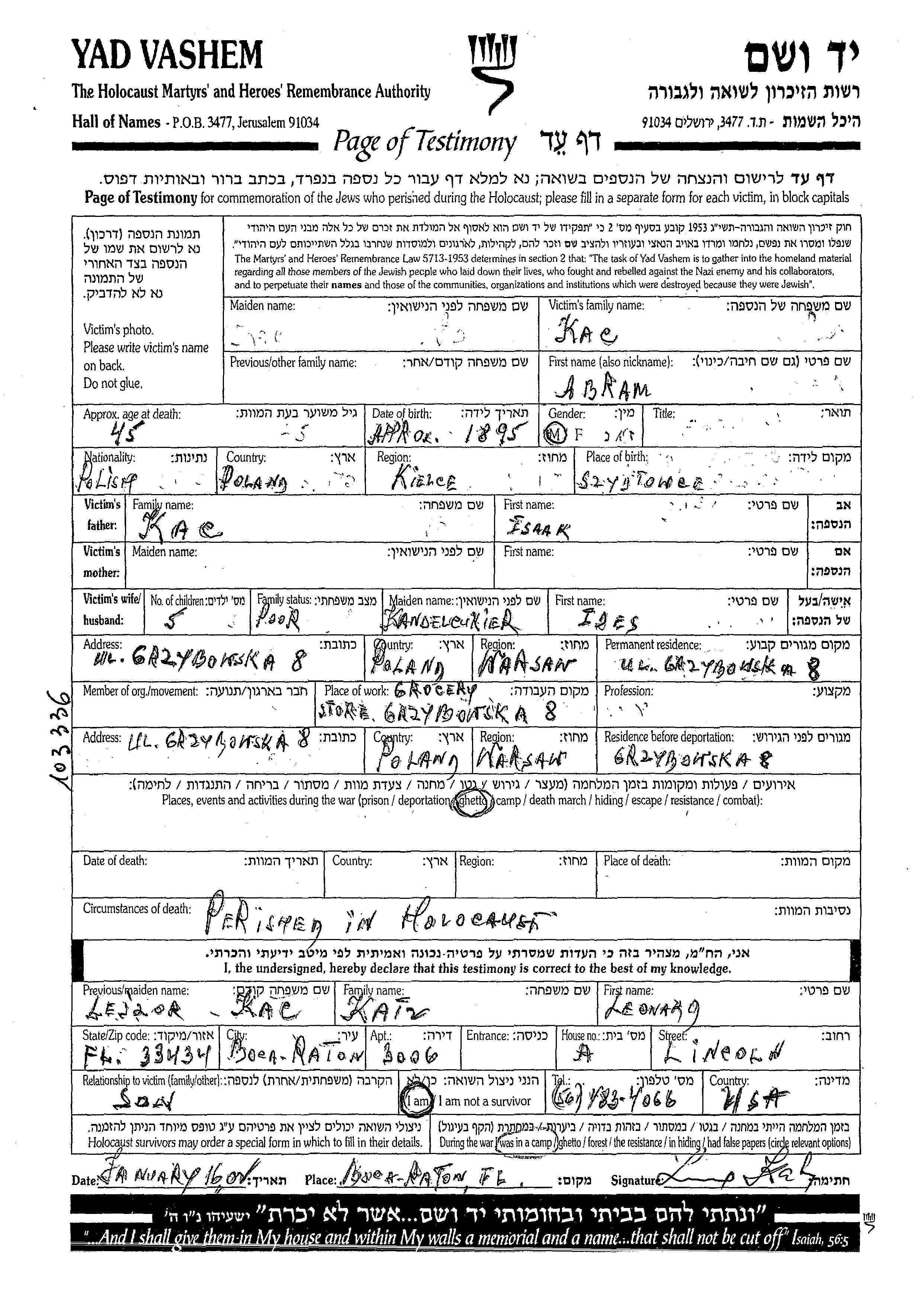 Abram Kac wurde im Jahr 1895 in Szydlowce, Polen geboren. Er war der Sohn von Isaak. Vor dem Zweiten Weltkrieg lebte er in Varsha, Polen. Während des Krieges war er in Varsha, Polen.