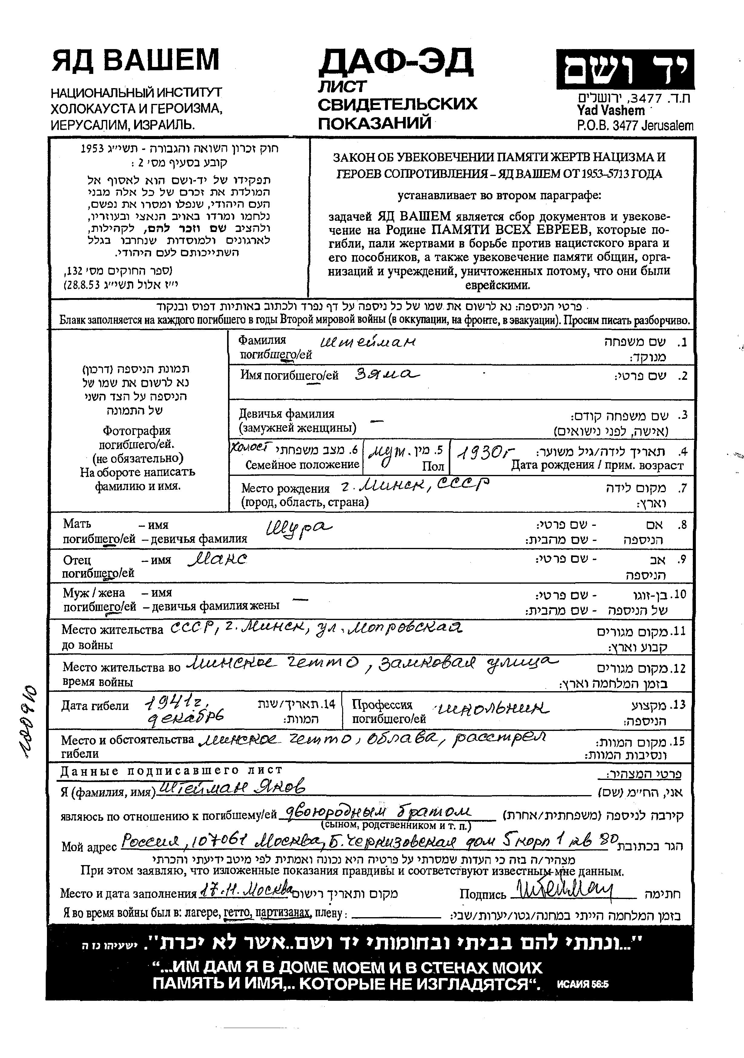 Zyama wurde in der Schoah ermordet. Todesort: Minsk, Weißrussland (UdSSR) im Jahr 1941.