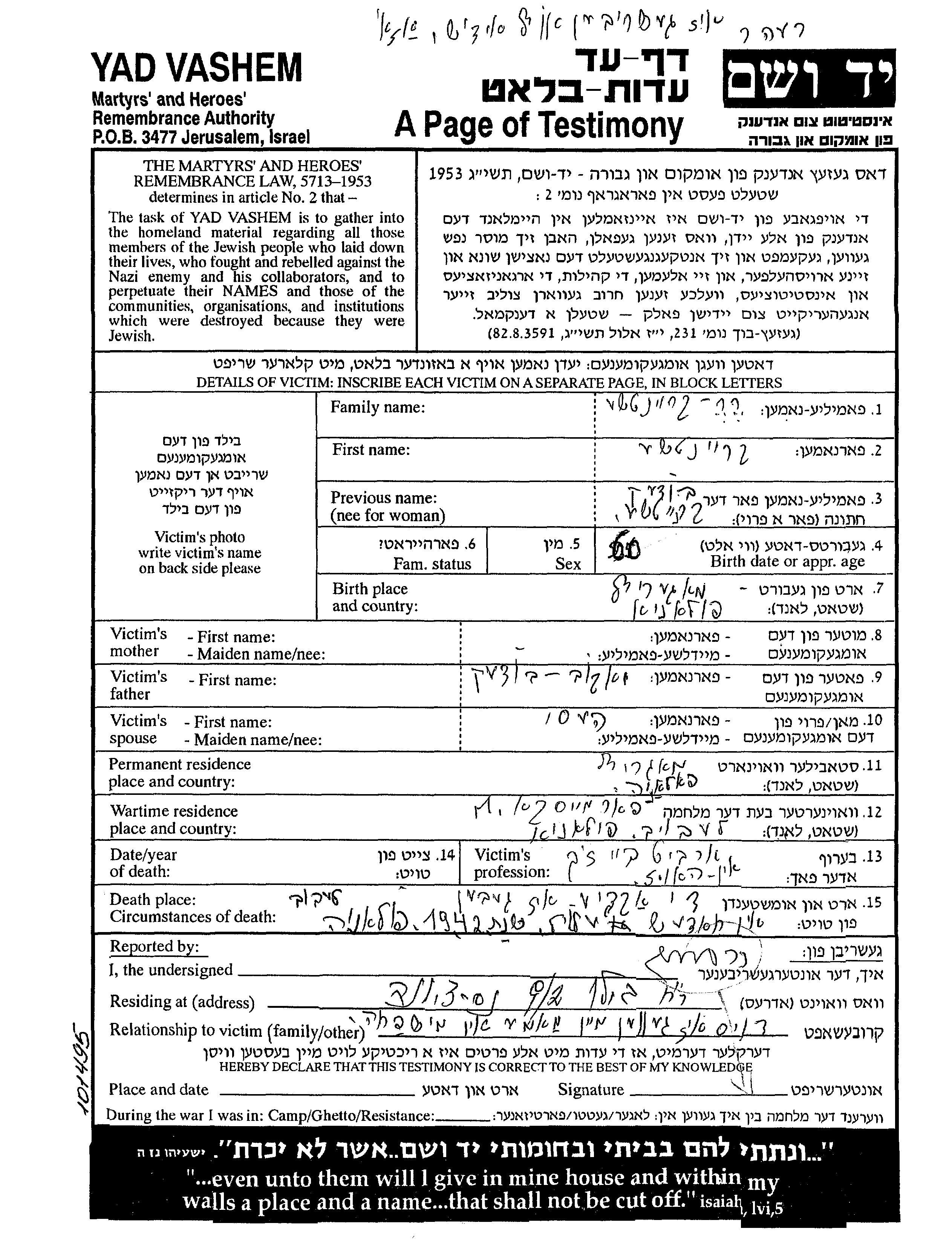 Kreina wurde in der Schoah ermordet. Todesort: Levov, Polen im Jahr 1942.