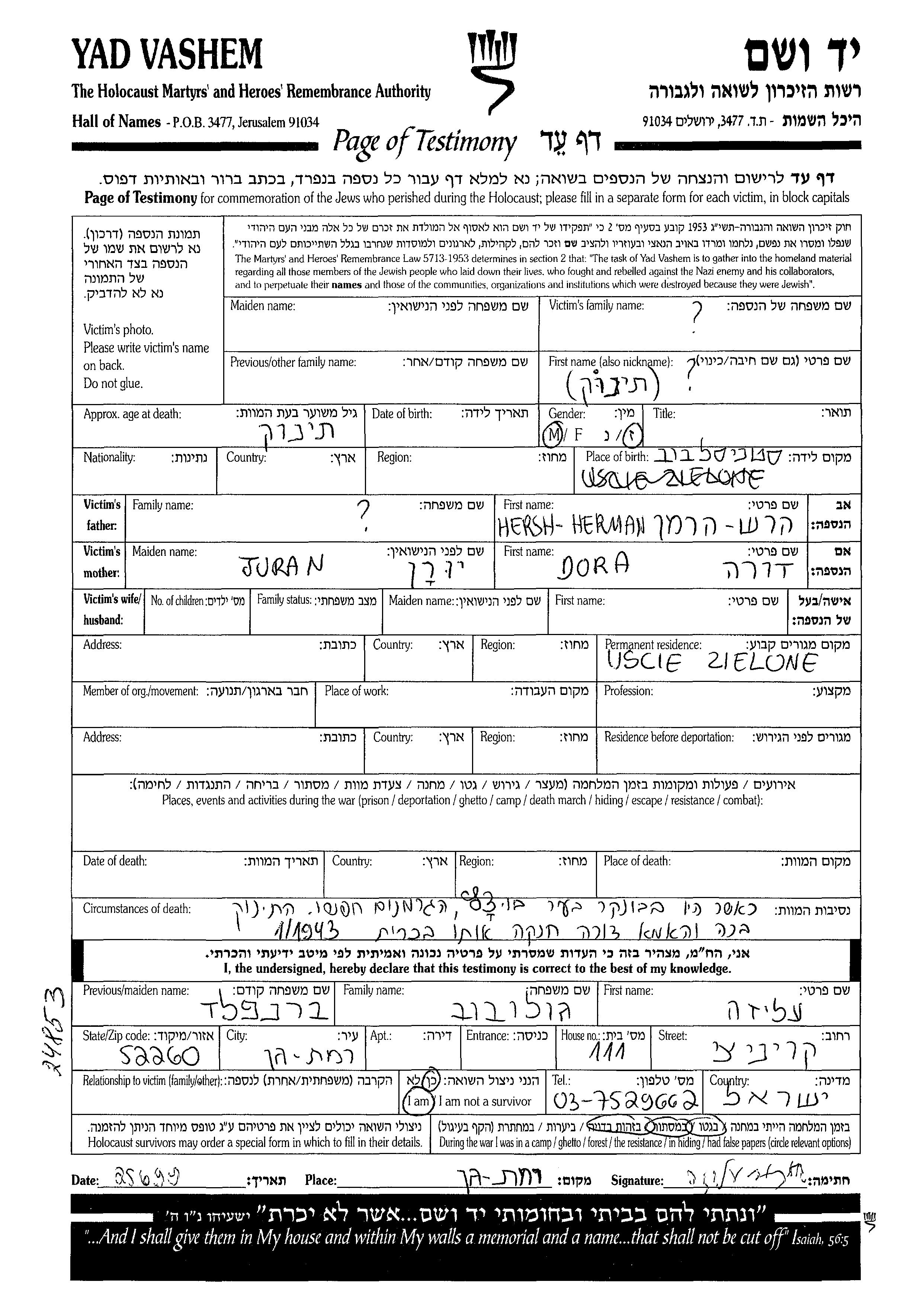 Vorname unbekannt Name unbekannt wurde in Stanislawow, Polen geboren. Er war der Sohn von Hersh Herman und Dora, geb. Juran. Er war Säugling. Vor dem Zweiten Weltkrieg lebte er in Uscie Zielone, Polen.