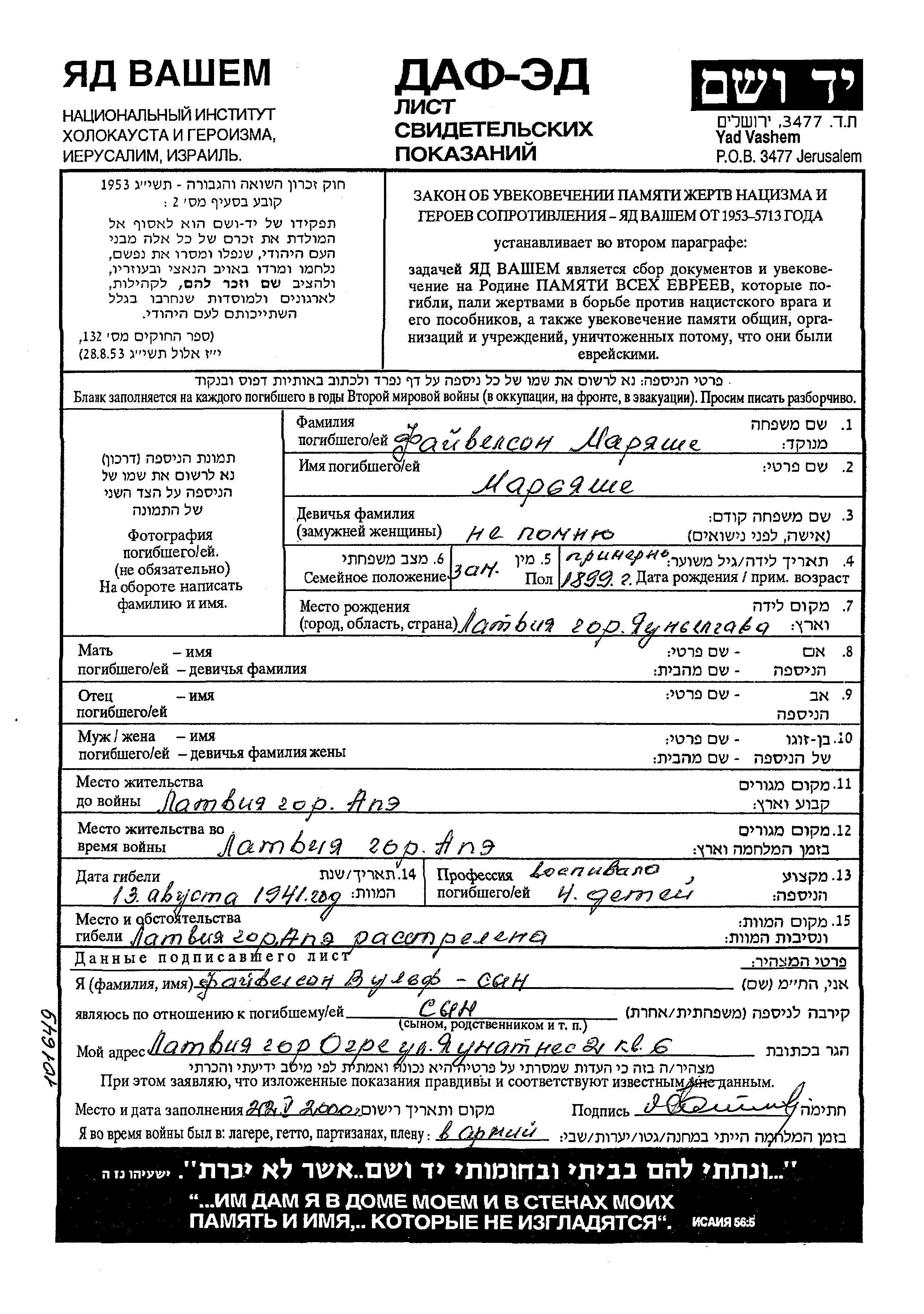 Maryashe Faivelson wurde im Jahr 1899 in Jaunijelgava, Lettland geboren. Sie war Hausfrau und Verheiratet. Vor dem Zweiten Weltkrieg lebte sie in Ape, Lettland. Während des Krieges war sie in Ape, Lettland.