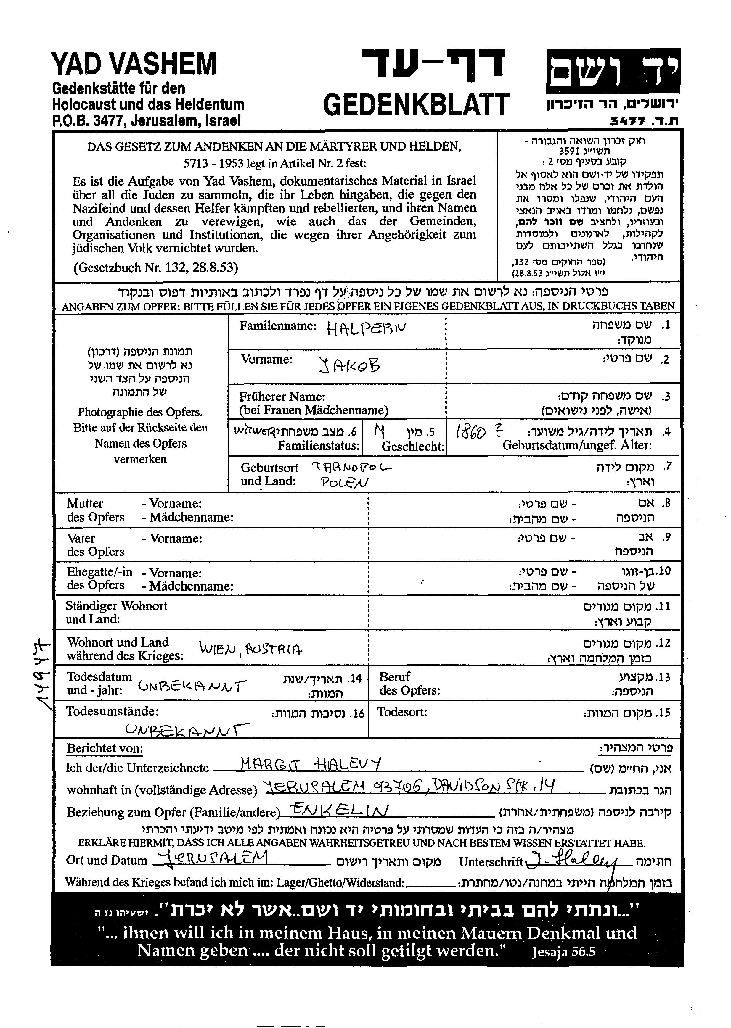 Jakob Halpern wurde im Jahr 1860 in Tarnopol, Polen geboren. Er war Witwer. Während des Krieges war er in Wien, Österreich.