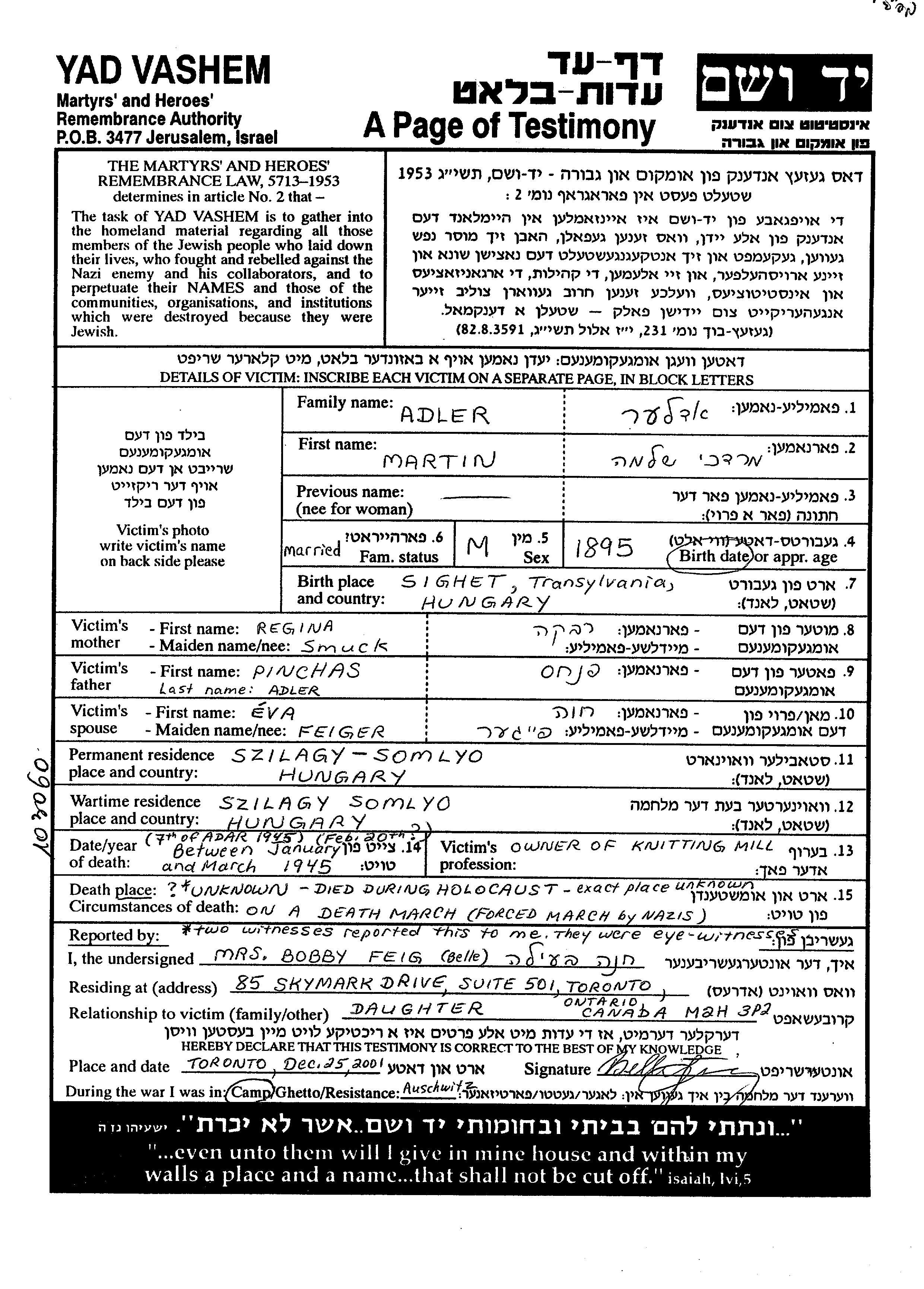 Martin Mordekhai Shlomo Adler wurde im Jahr 1895 in Sighet, Rumänien geboren. Er war der Sohn von Pinchas und Regina Rivka. Er war Mühlenbesitzer und mit Eva Khava, geb. Feiger Verheiratet. Vor dem Zweiten Weltkrieg lebte er in Szilagy Somlyo, Rumänien. Während des Krieges war er in Szilagy Somlyo, Rumänien.