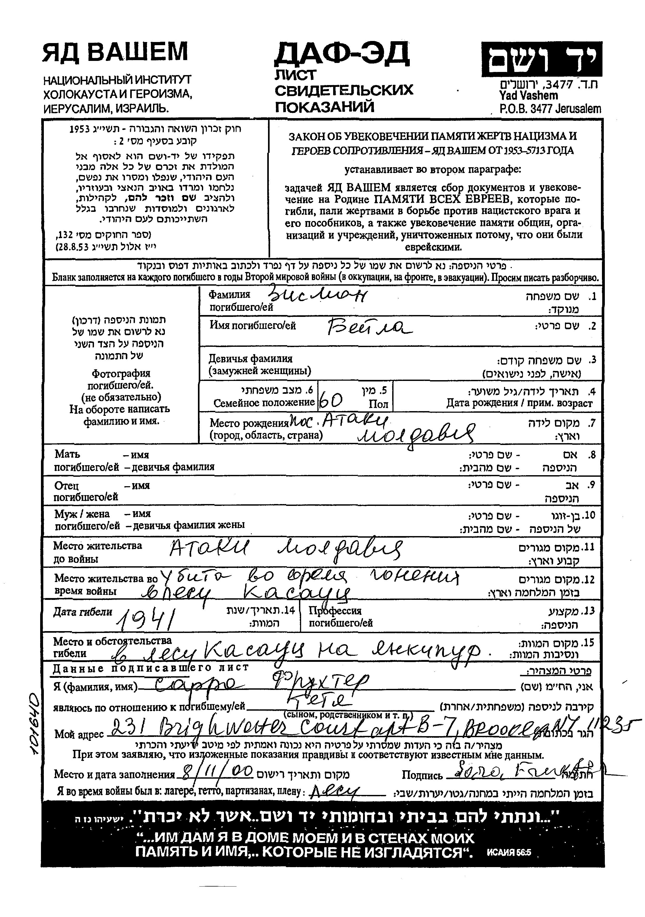 Beila wurde in der Schoah ermordet. Todesort: Cosauti Forest, Rumänien im Jahr 1941.