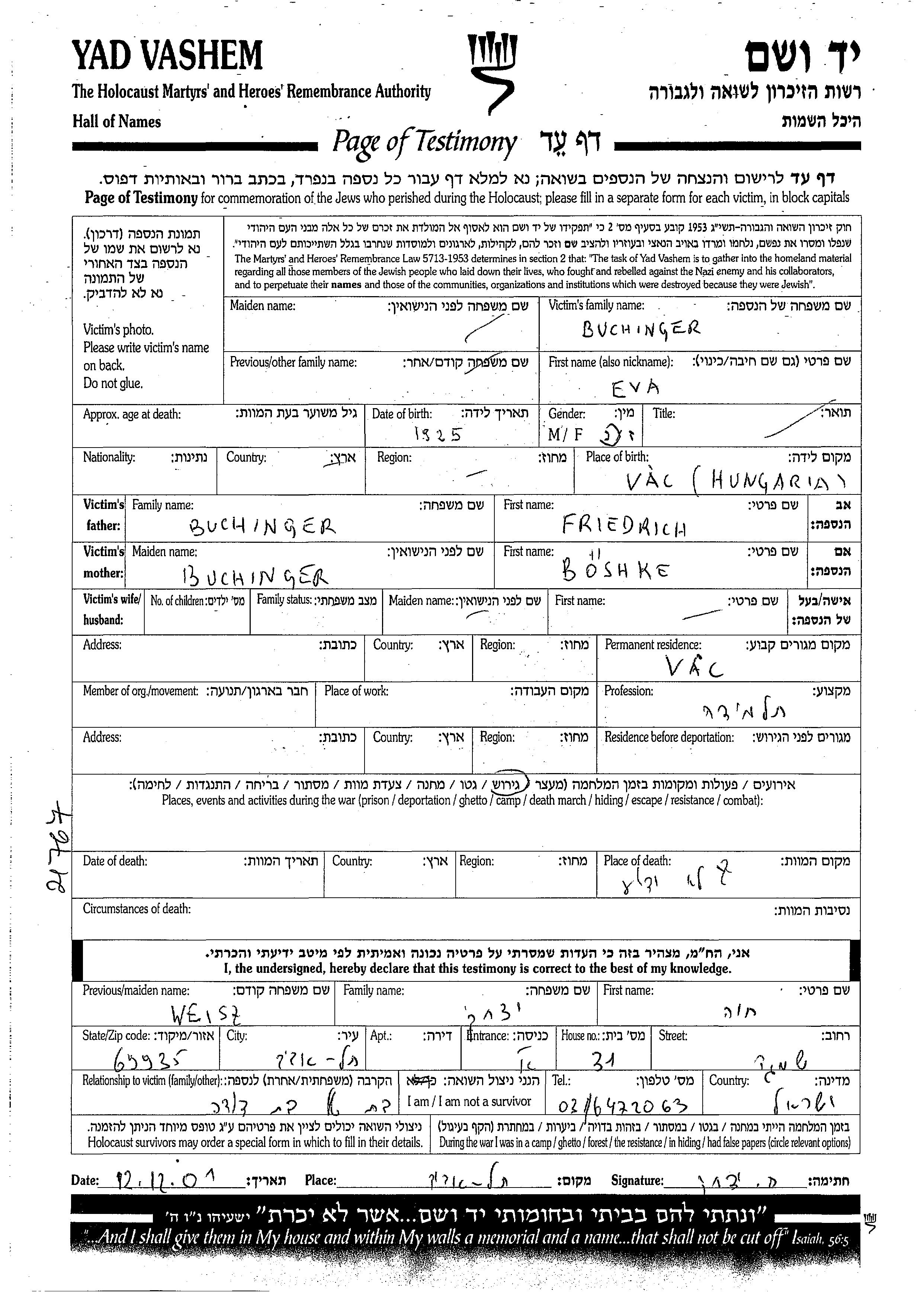Eva wurde in der Schoah ermordet.