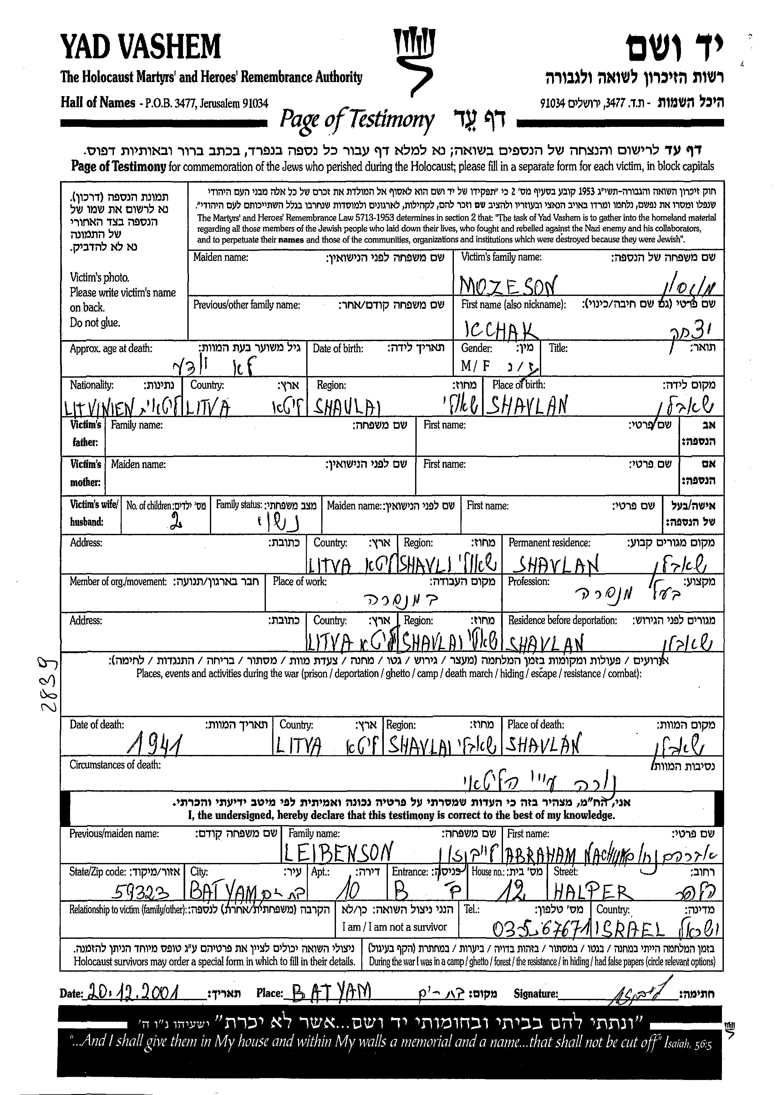 Icchak Mozeson wurde in Shavlan, Litauen geboren. Er war Sägewerksbesitzer und Verheiratet. Vor dem Zweiten Weltkrieg lebte er in Shavlan, Litauen. Während des Krieges war er in Shavlan, Litauen.