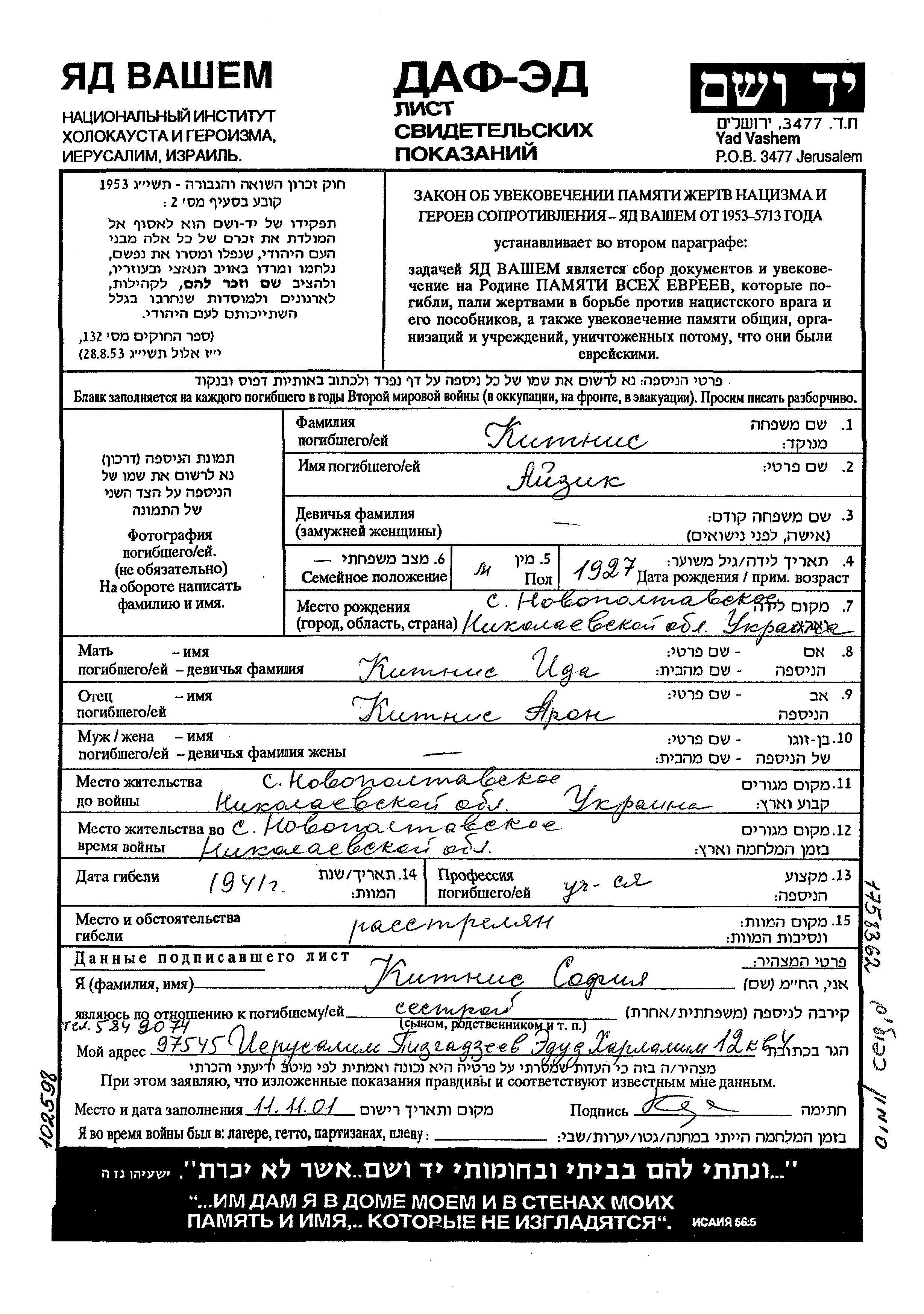 Kitnis Aizik 1927 Novo Poltavka, Ukraine (UdSSR) Gedenkblatt