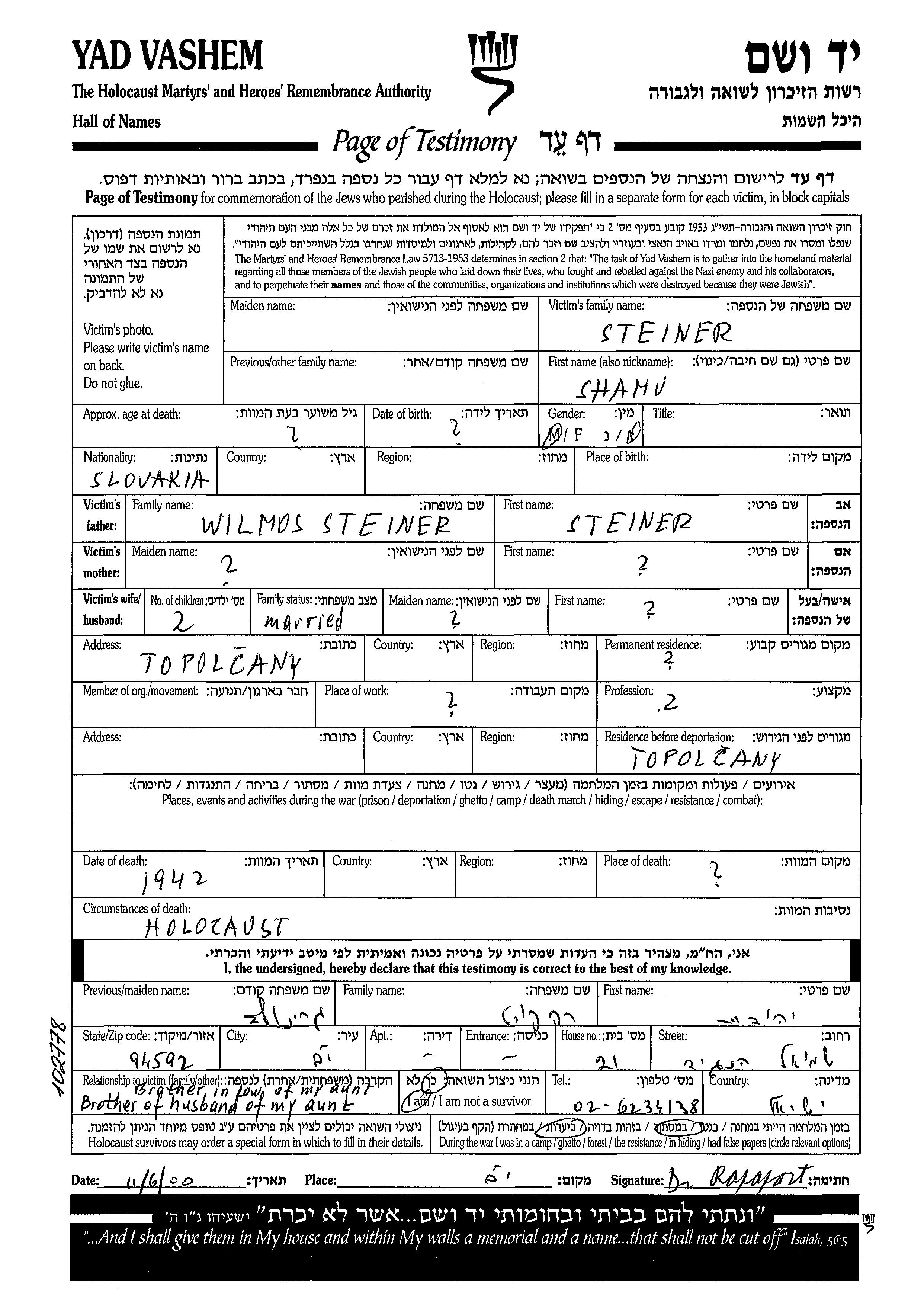 Shamu Steiner wurde Er war der Sohn von Wilmos. Er war Verheiratet. Vor dem Zweiten Weltkrieg lebte er in Topolcany, Tschechoslowakei. Während des Krieges war er in Topolcany, Tschechoslowakei.