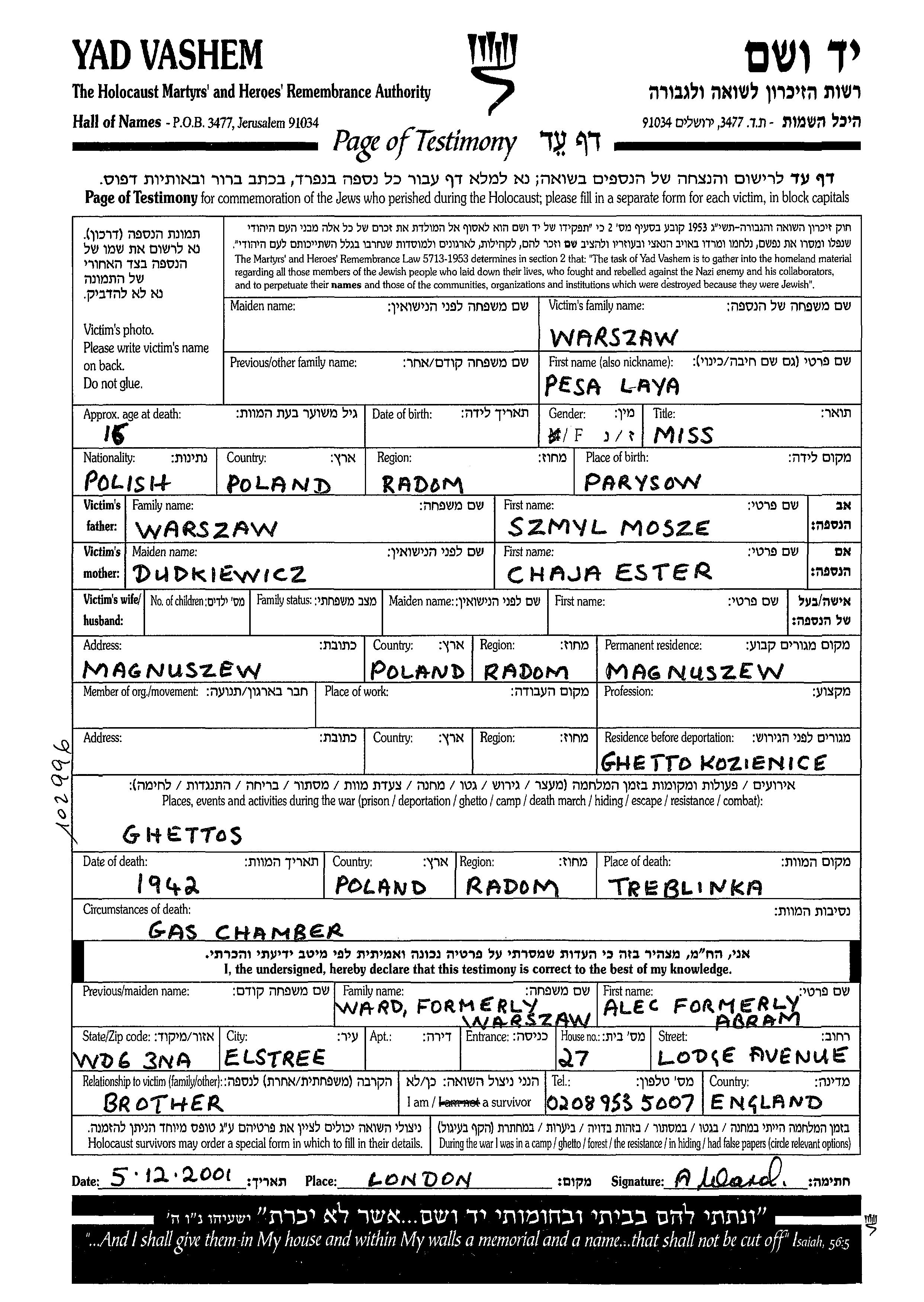Pesa Laya Warszaw wurde in Parysow, Polen geboren. Sie war die Tochter von Szmyl Mosze und Chaja Ester. Vor dem Zweiten Weltkrieg lebte sie in Magnuszew, Polen. Während des Krieges war sie in Kozienice, Polen.